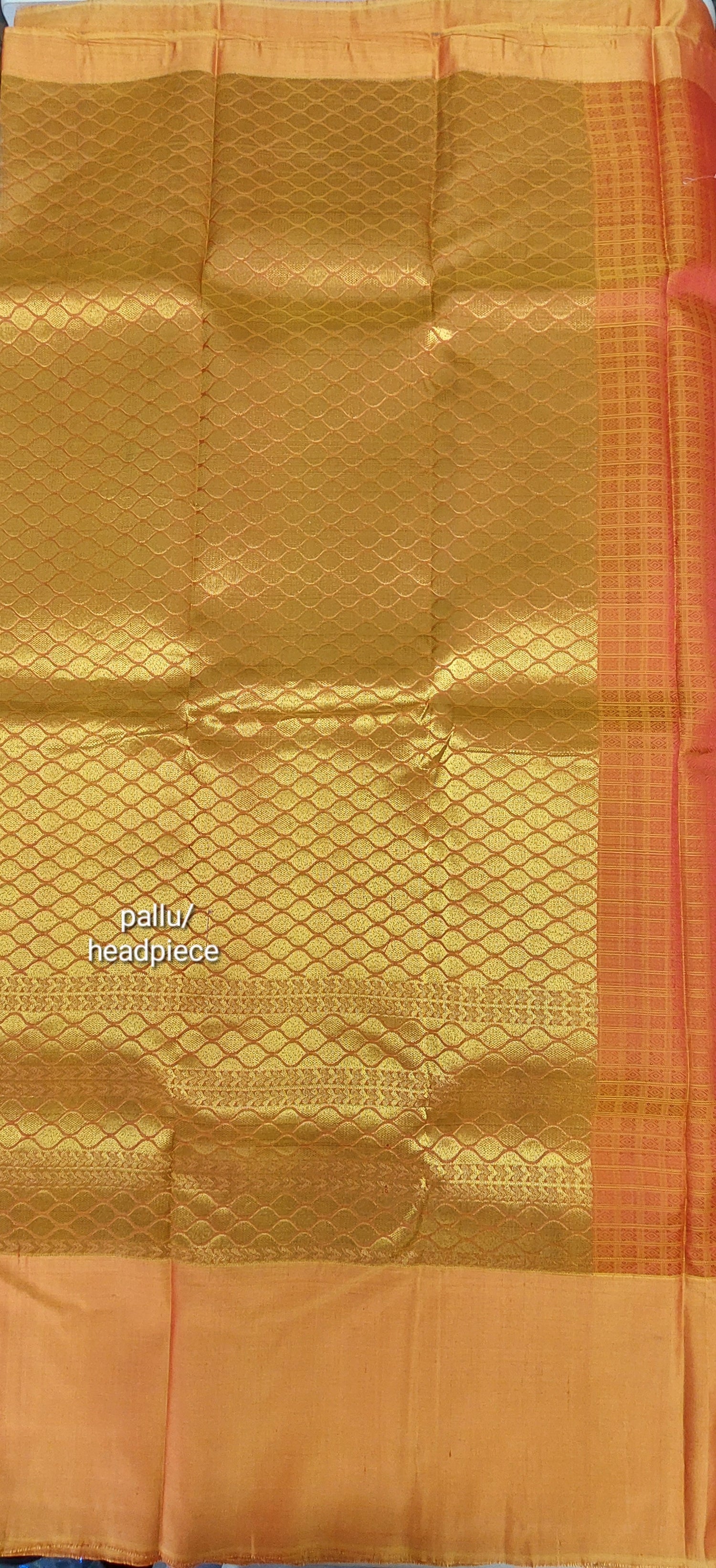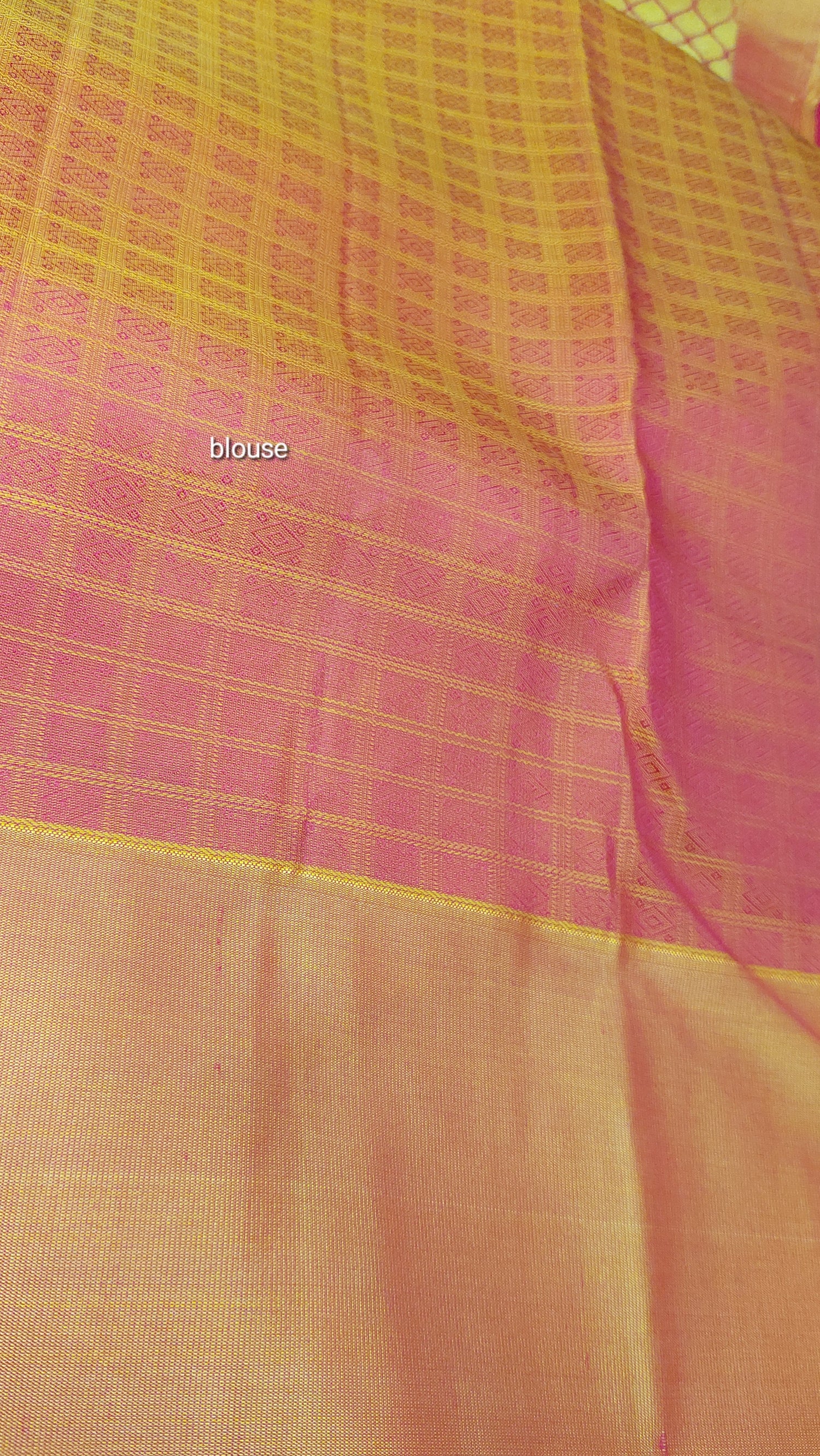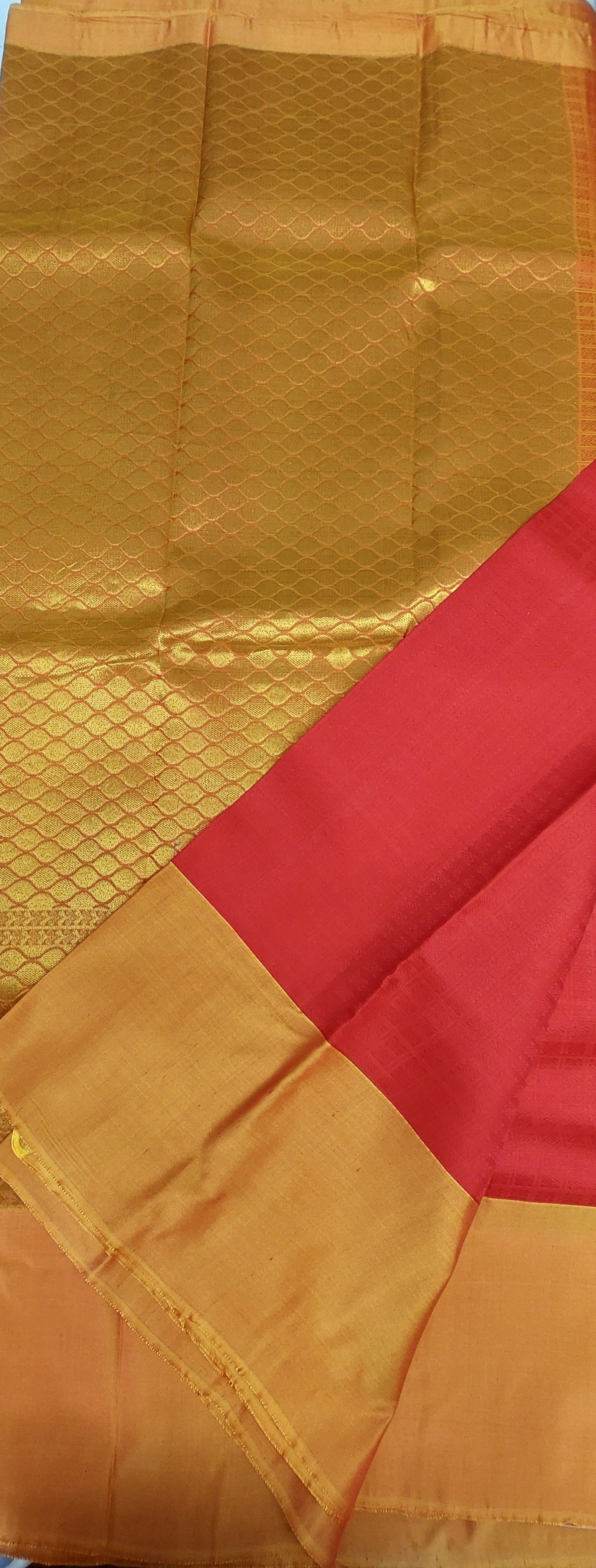 Red Kanjipuram Silk saree with yellow gollow block border. Contrasting pallu/ headpiece. Running contrasting blouse.