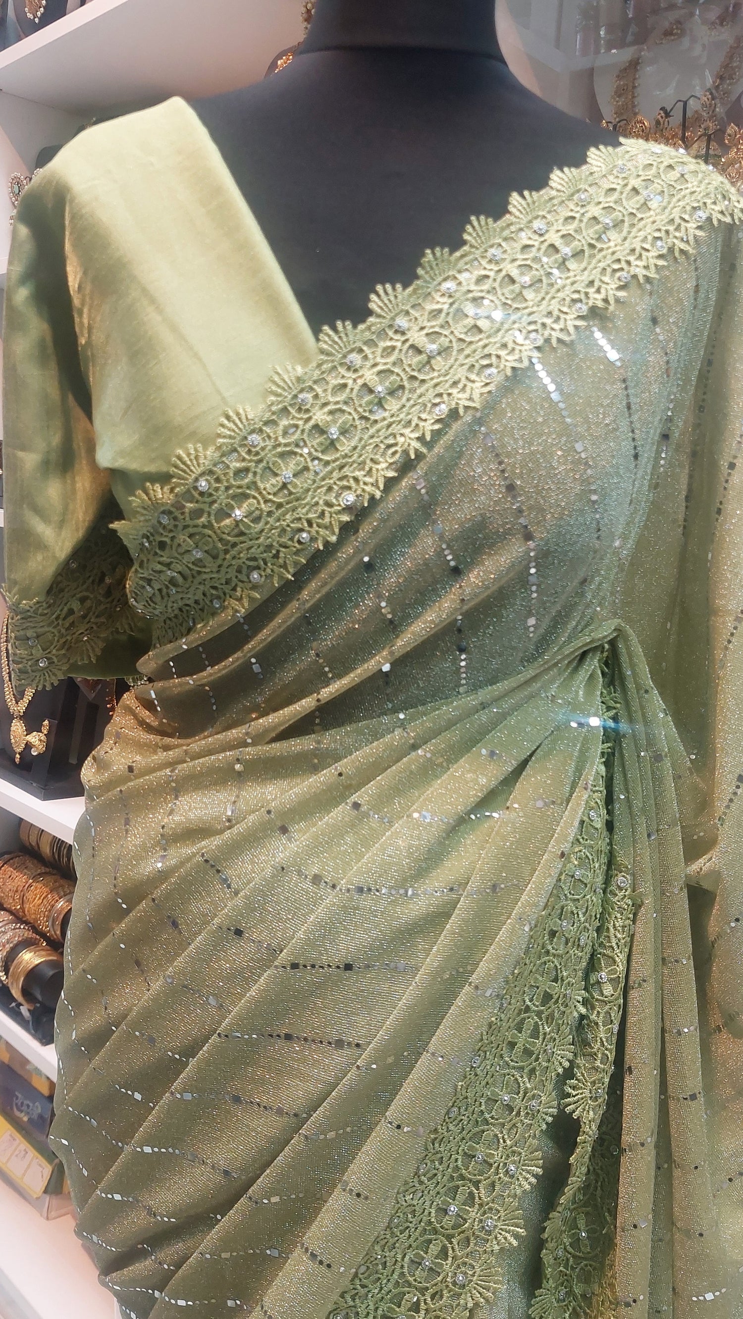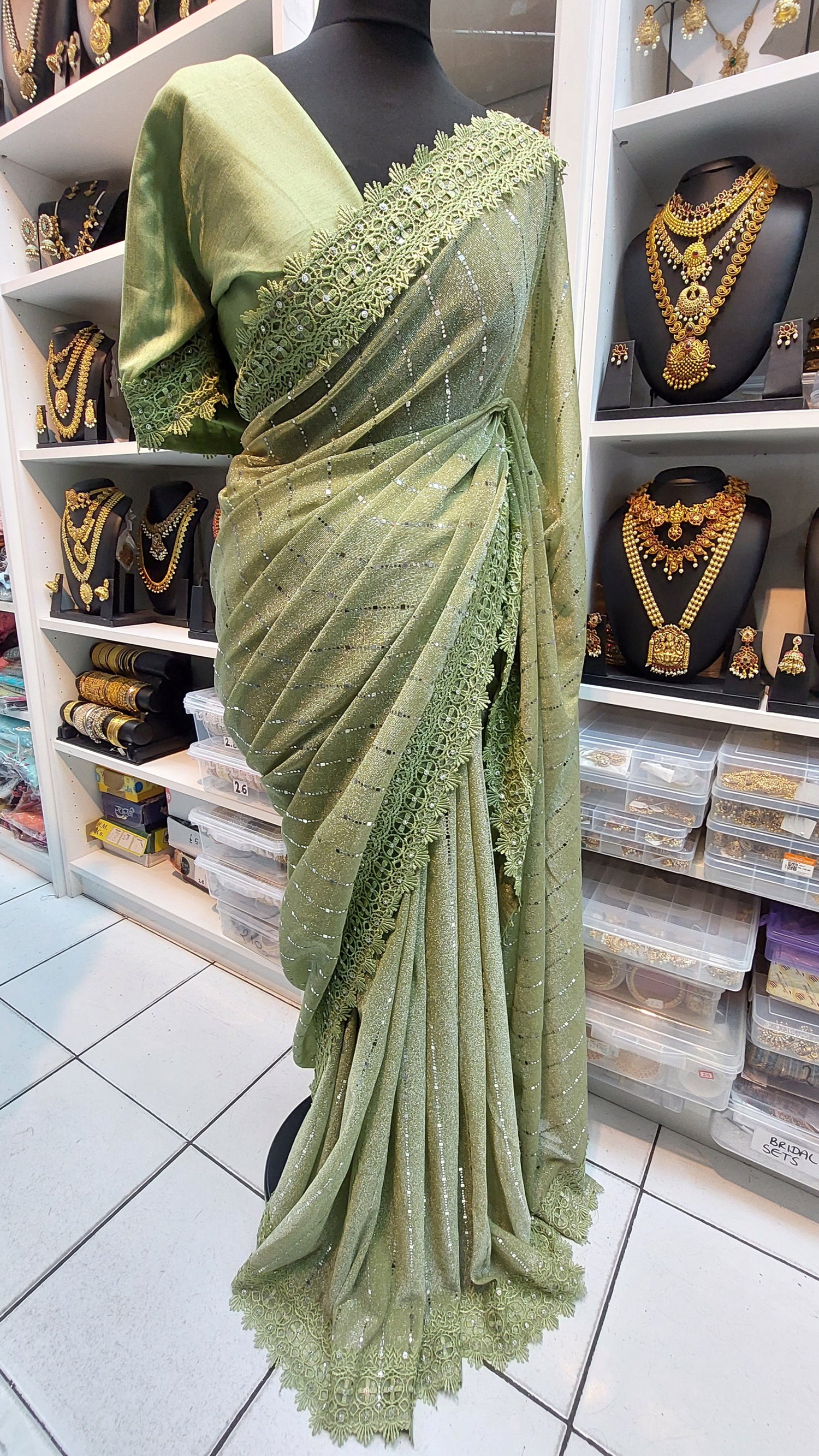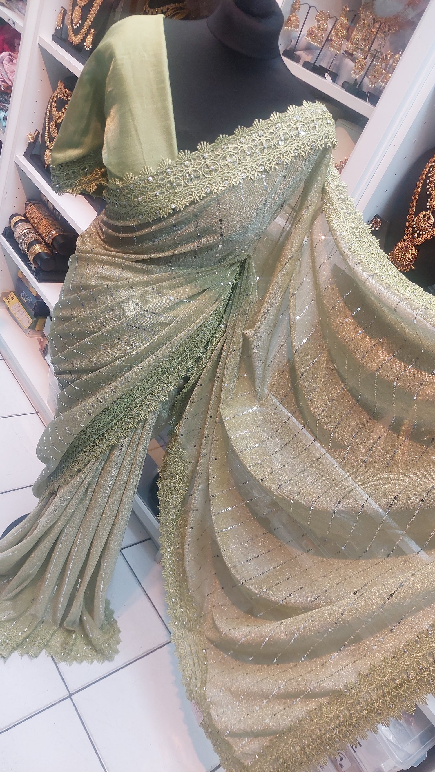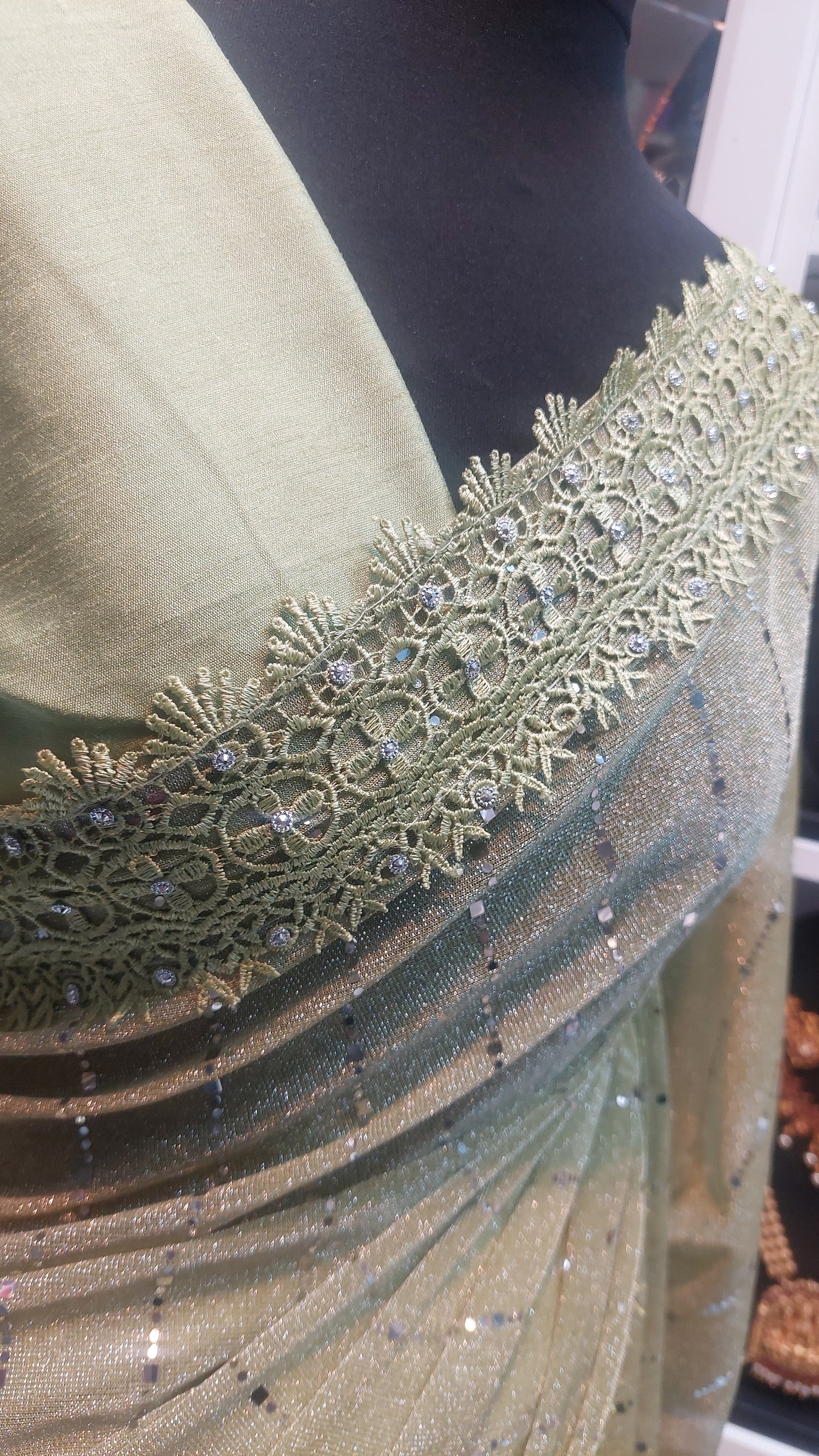Light green designer saree with lace border. Comes with plain blouse material with lace border.