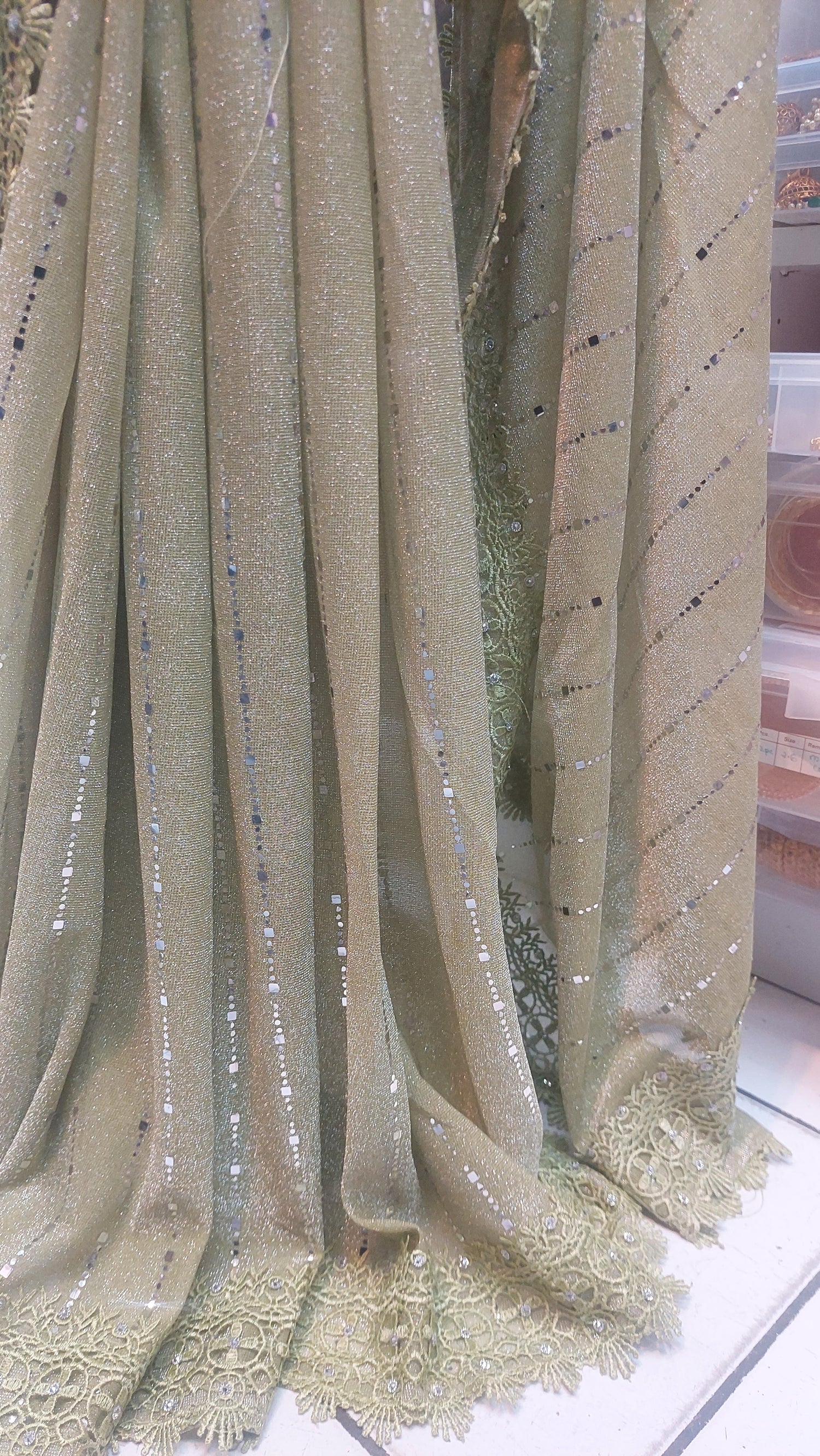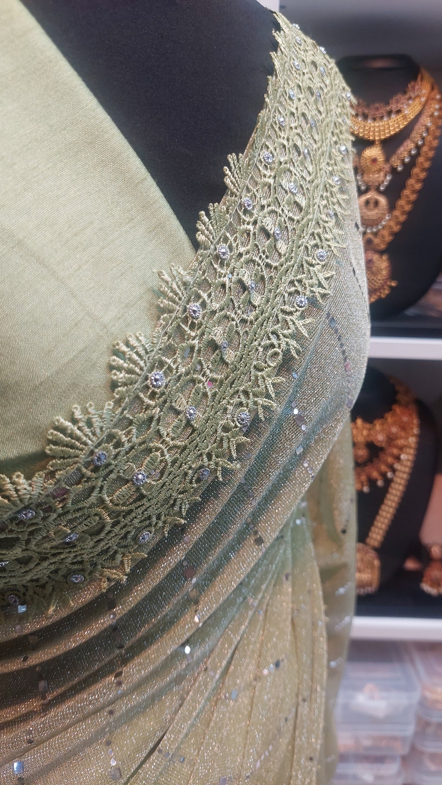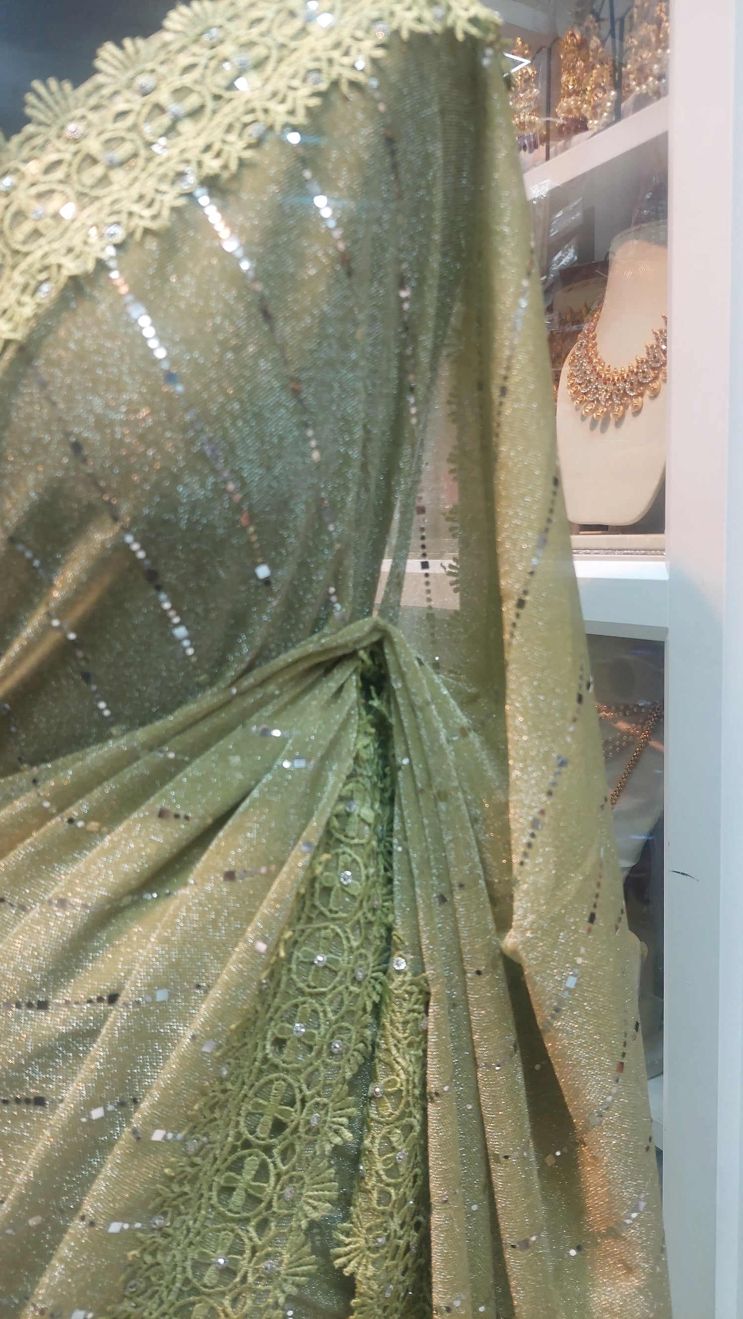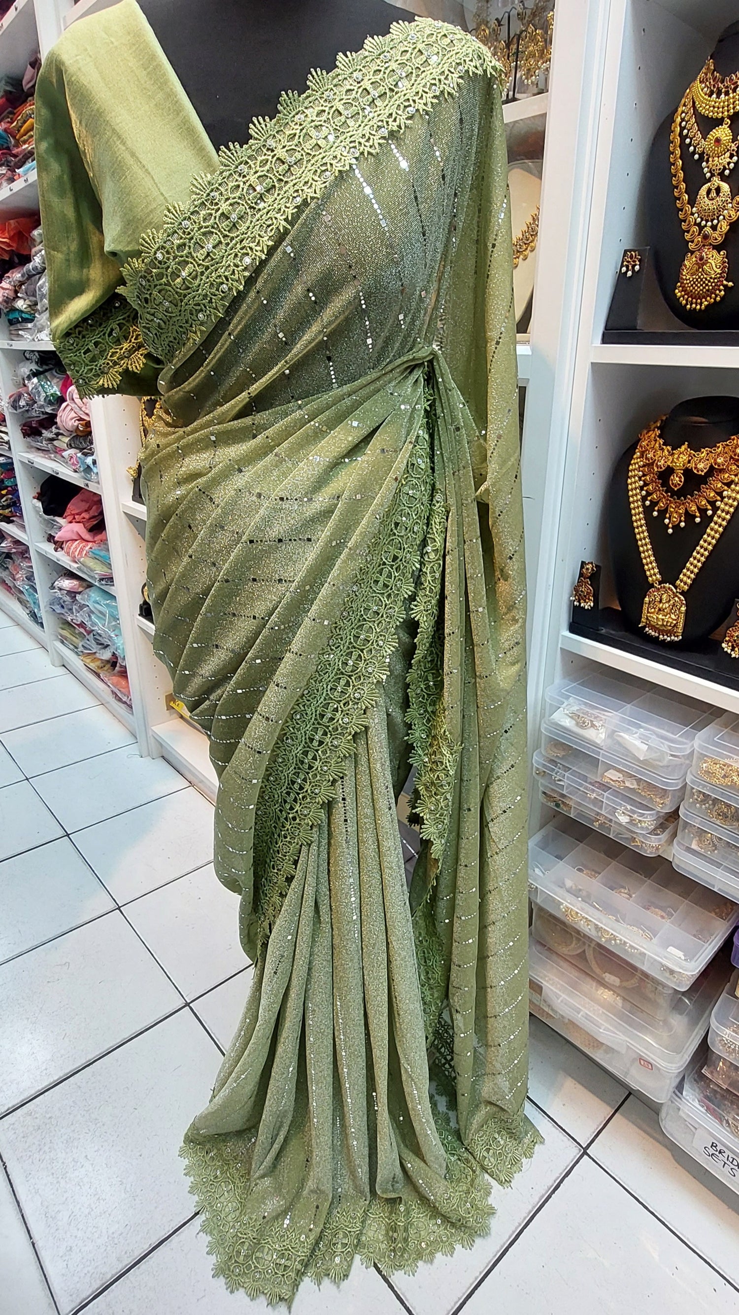 Light green designer saree with lace border. Comes with plain blouse material with lace border.