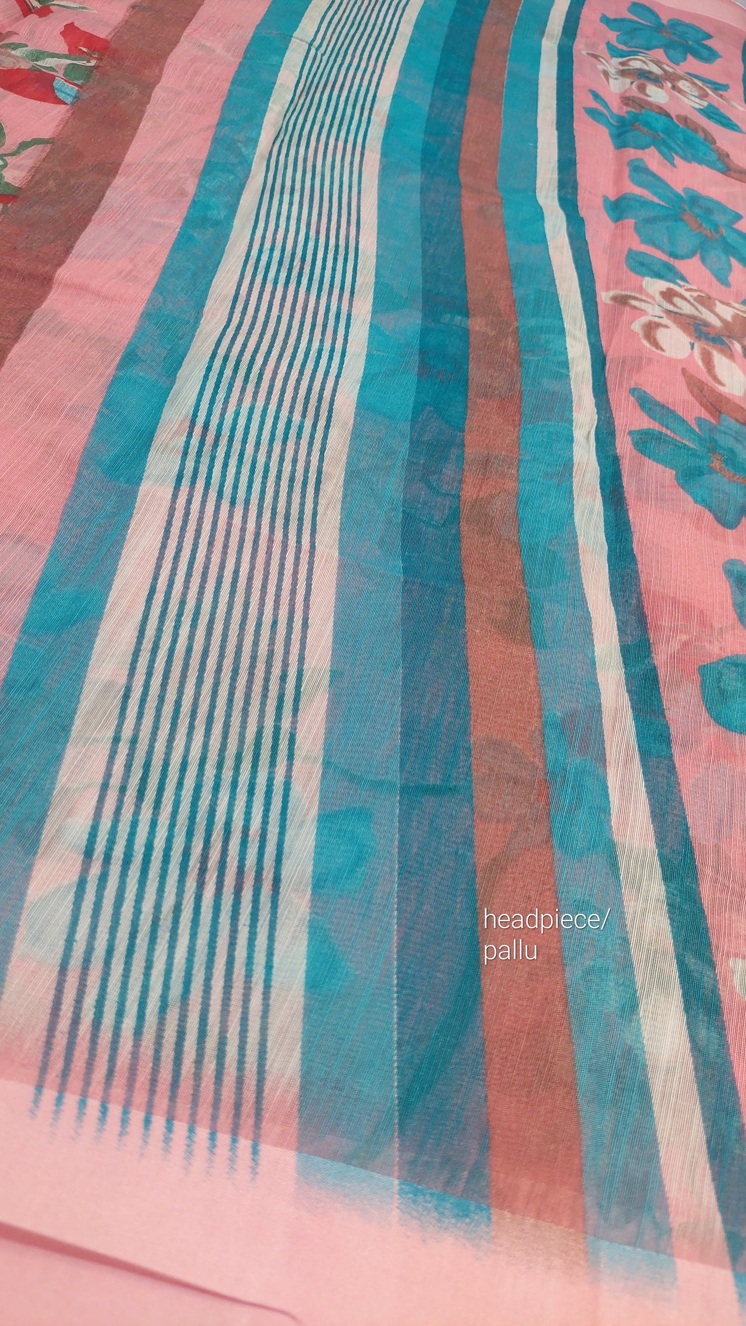Linen saree in salmon pink with satin border. Contrasting plain pink blouse piece.