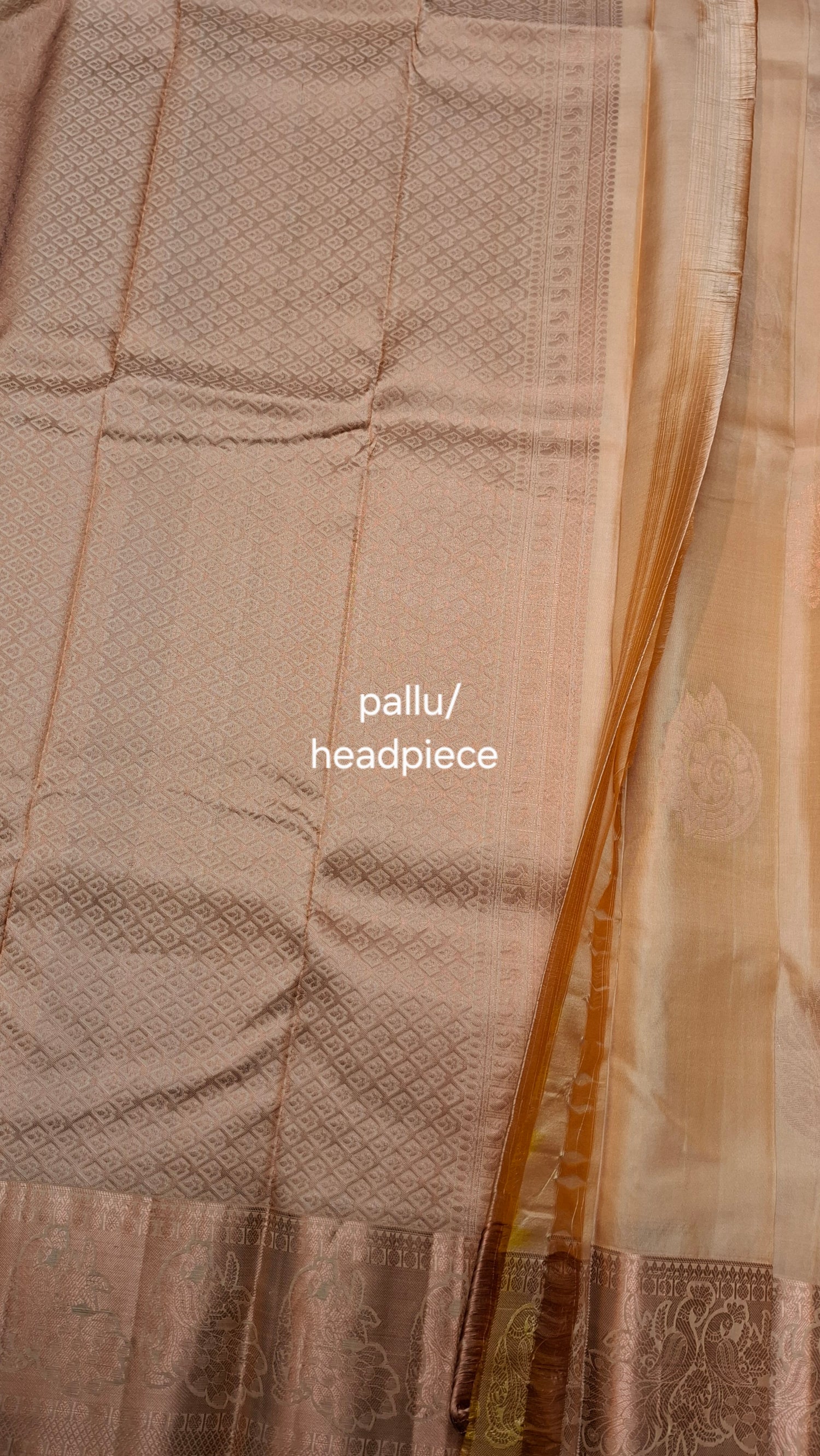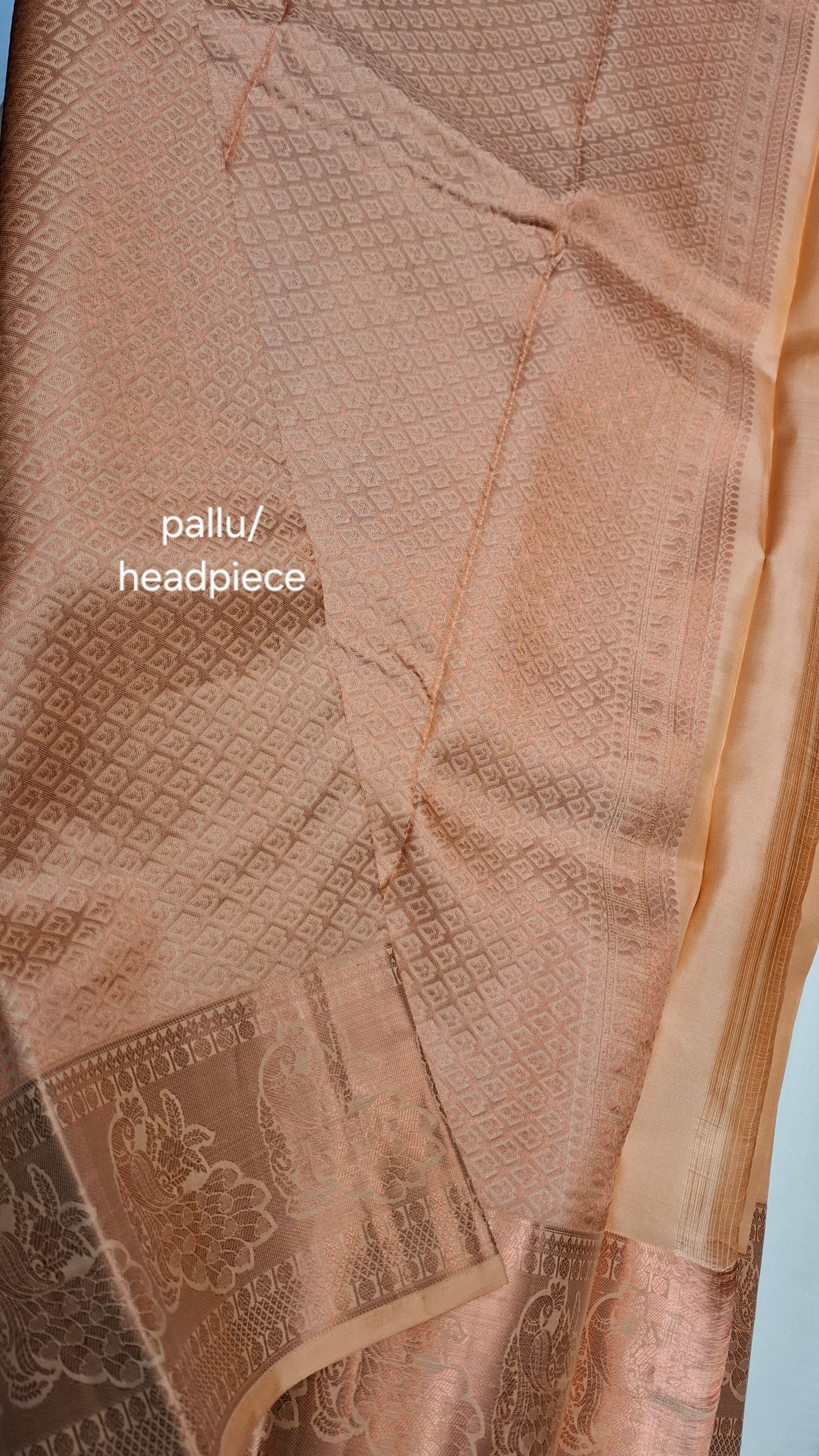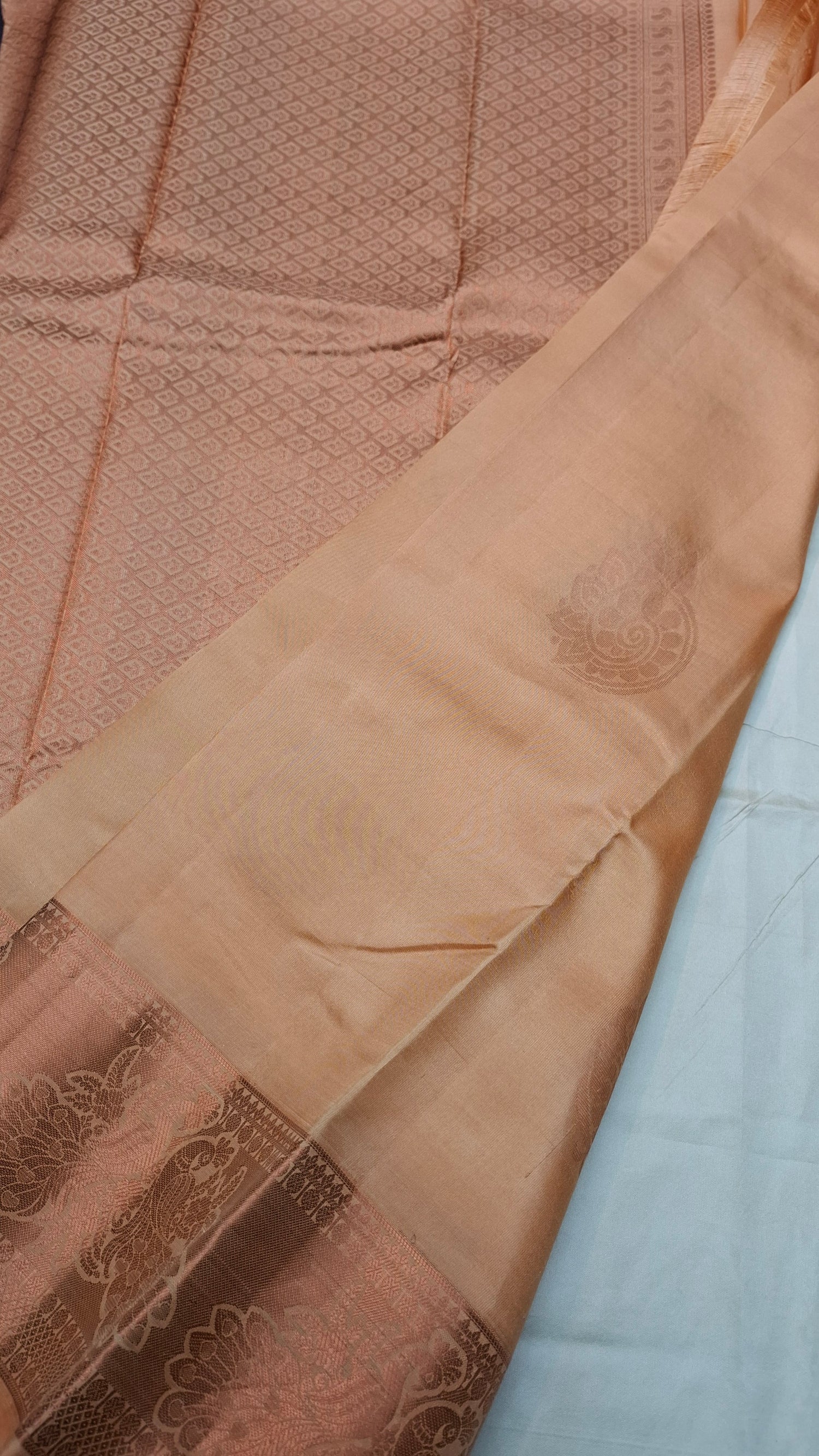 Sand pinkish/ orange pure Kanjipuram Silk saree with copper zari border. Rich pallu/ headpiece with running blouse piece.
