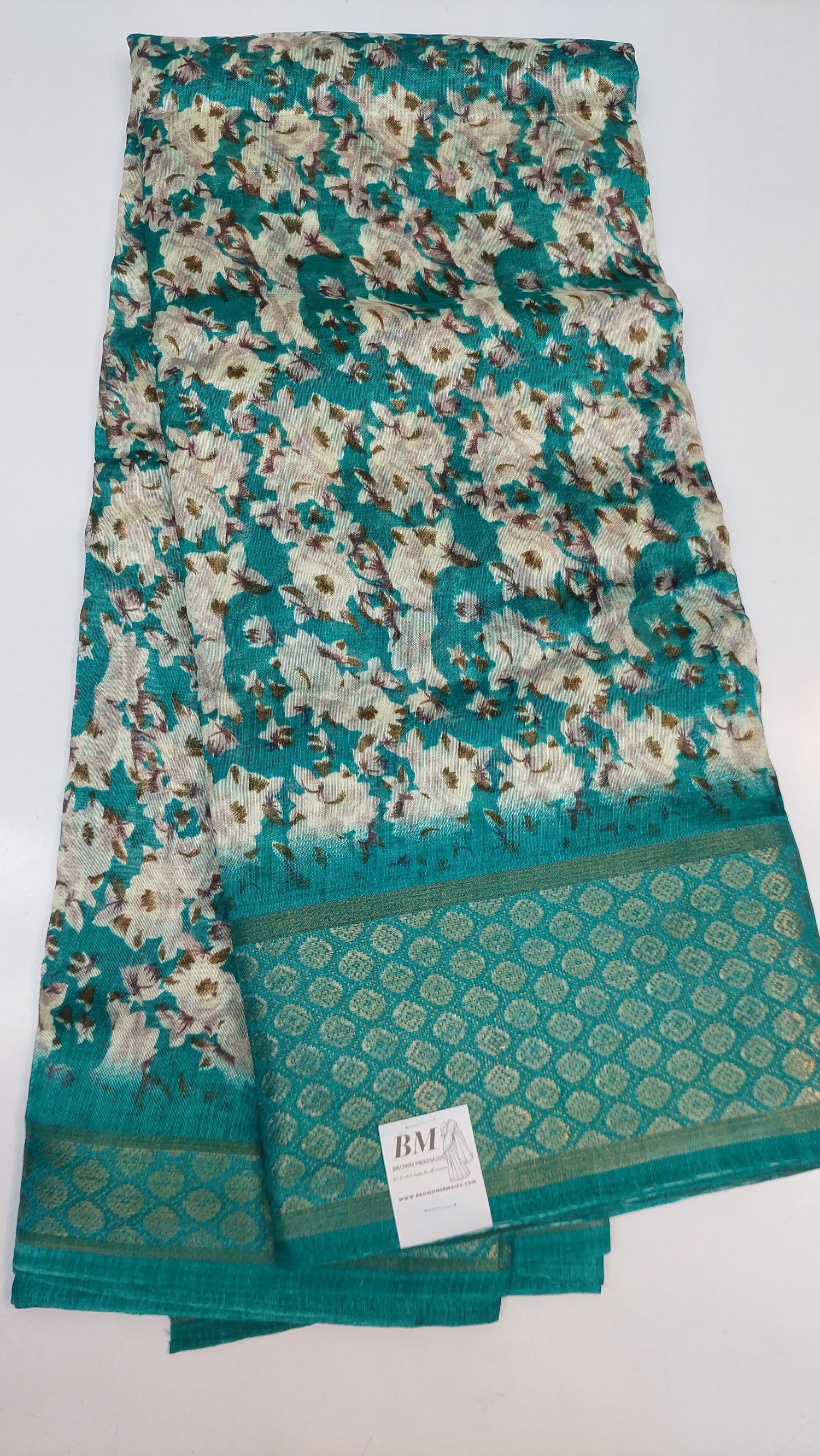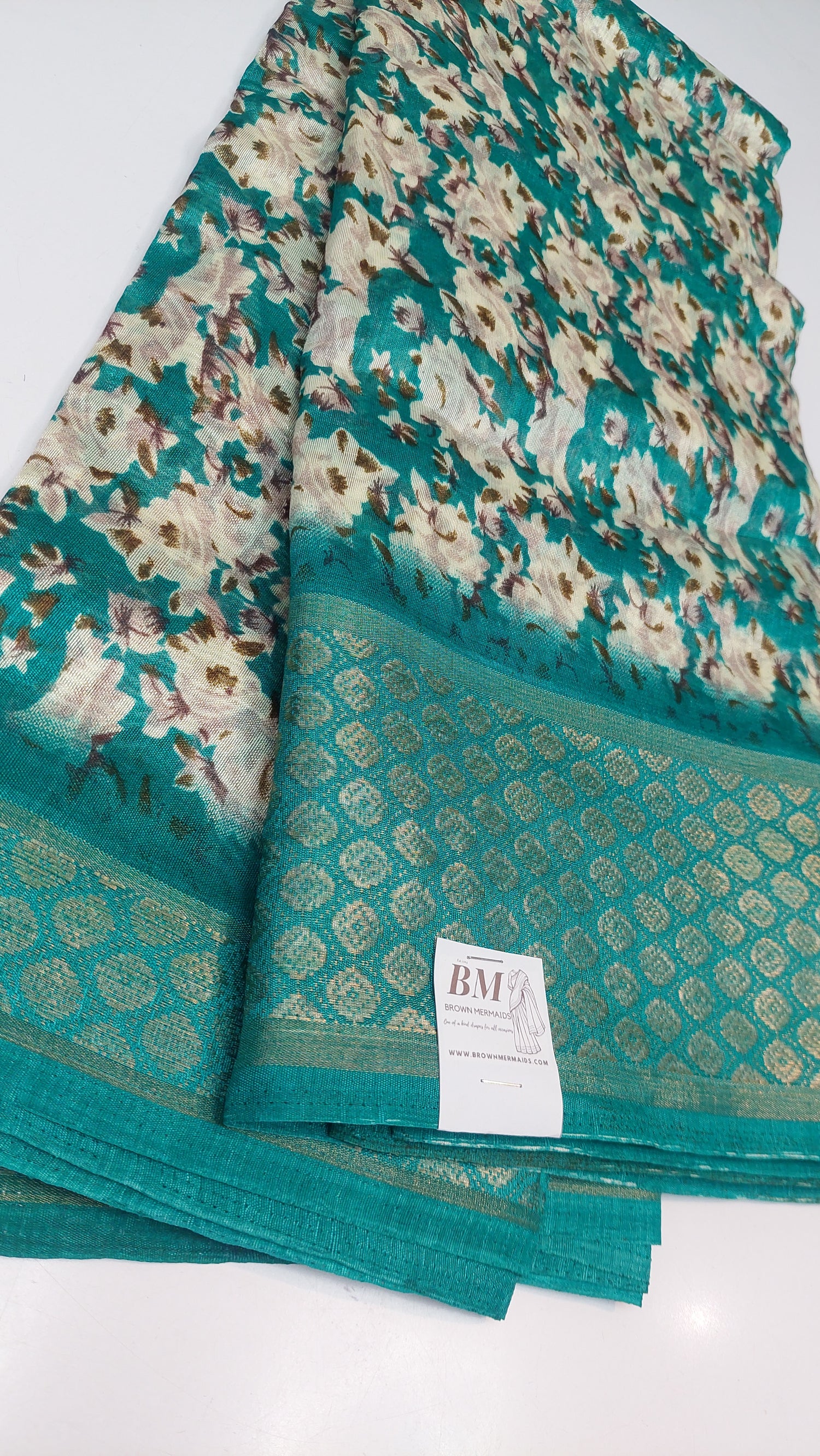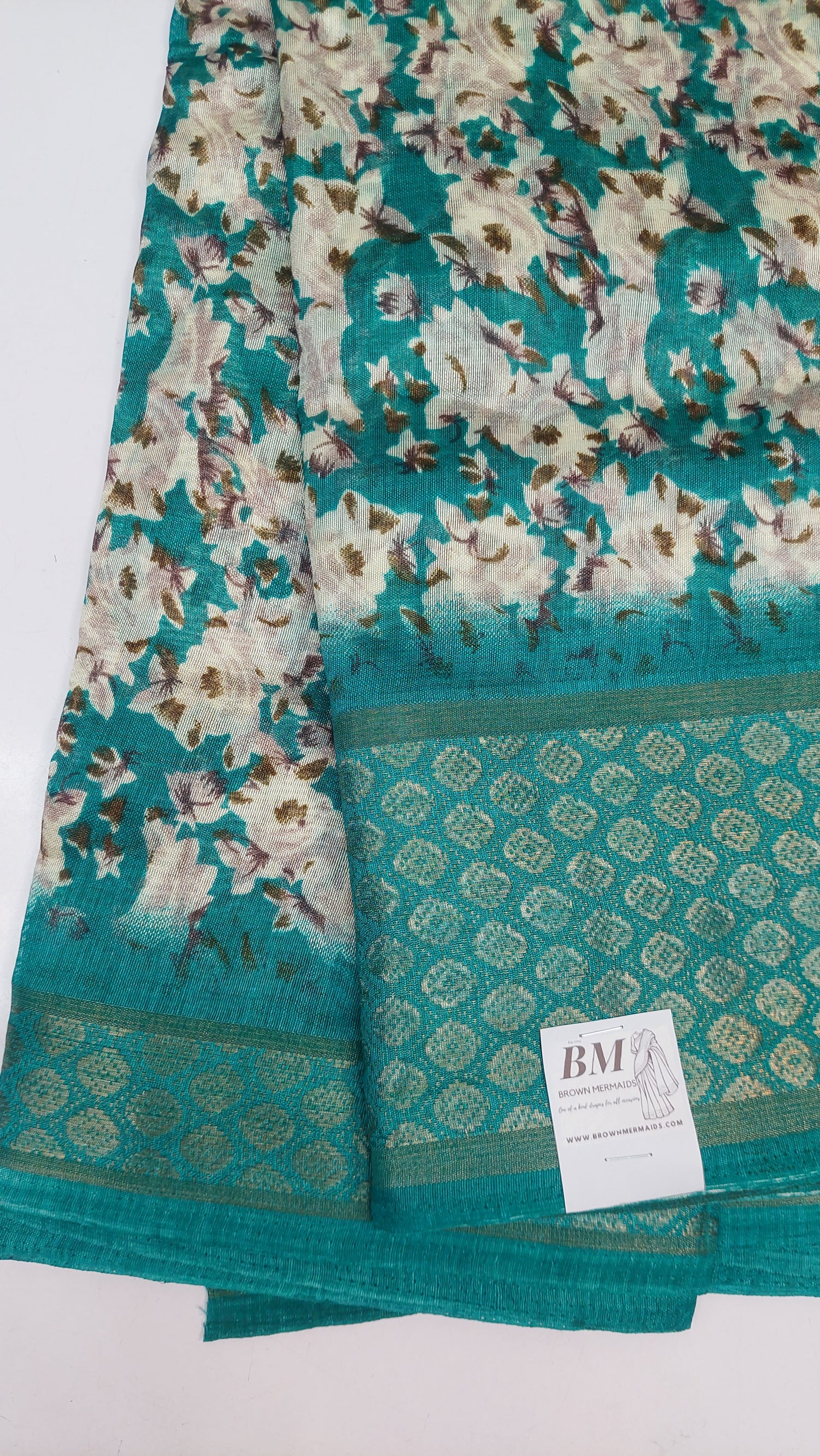 Mixed cotton floral printed saree with golf zari polka dot border. Contracting pallu/headpiece. Running plain blouse.