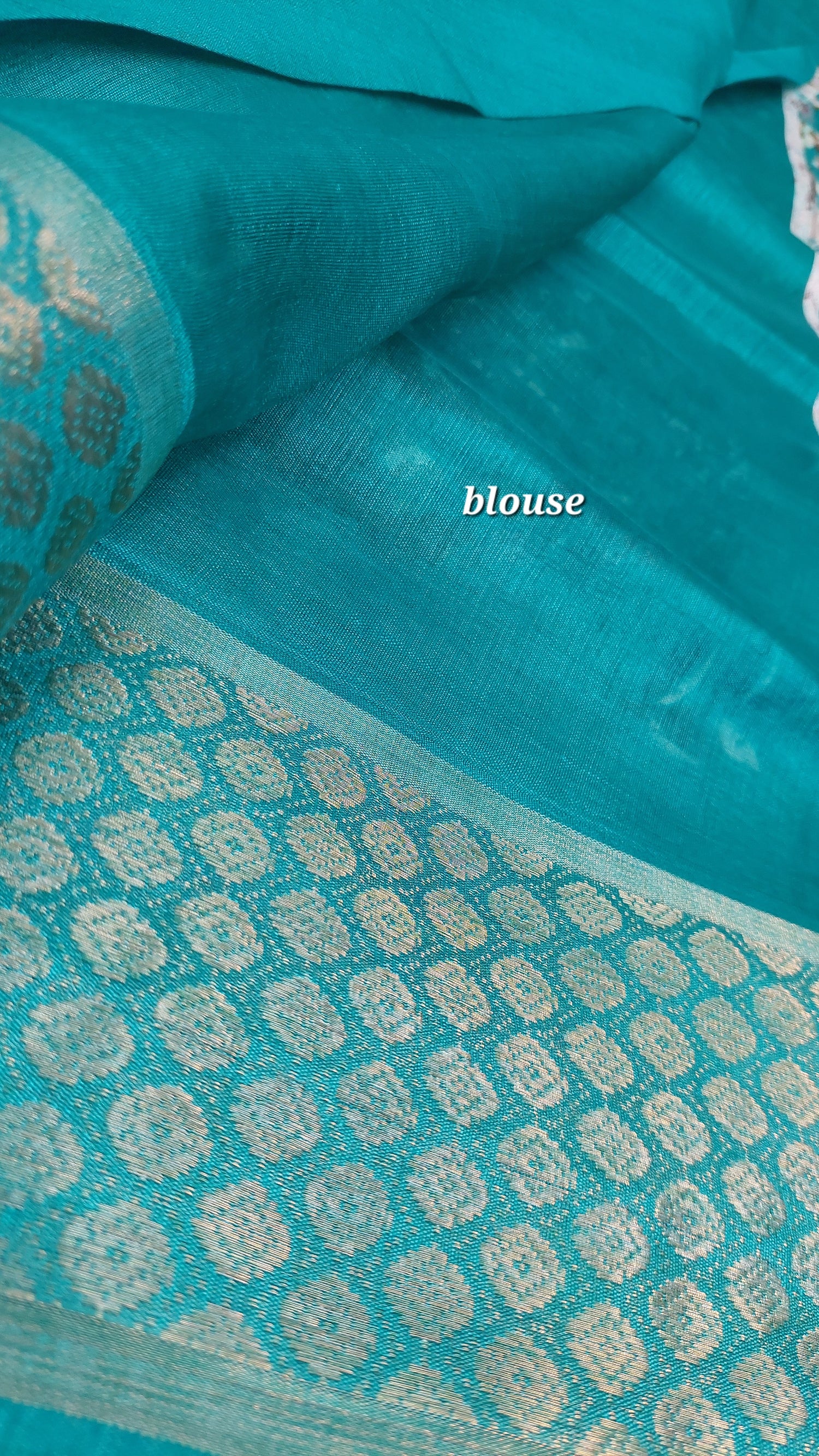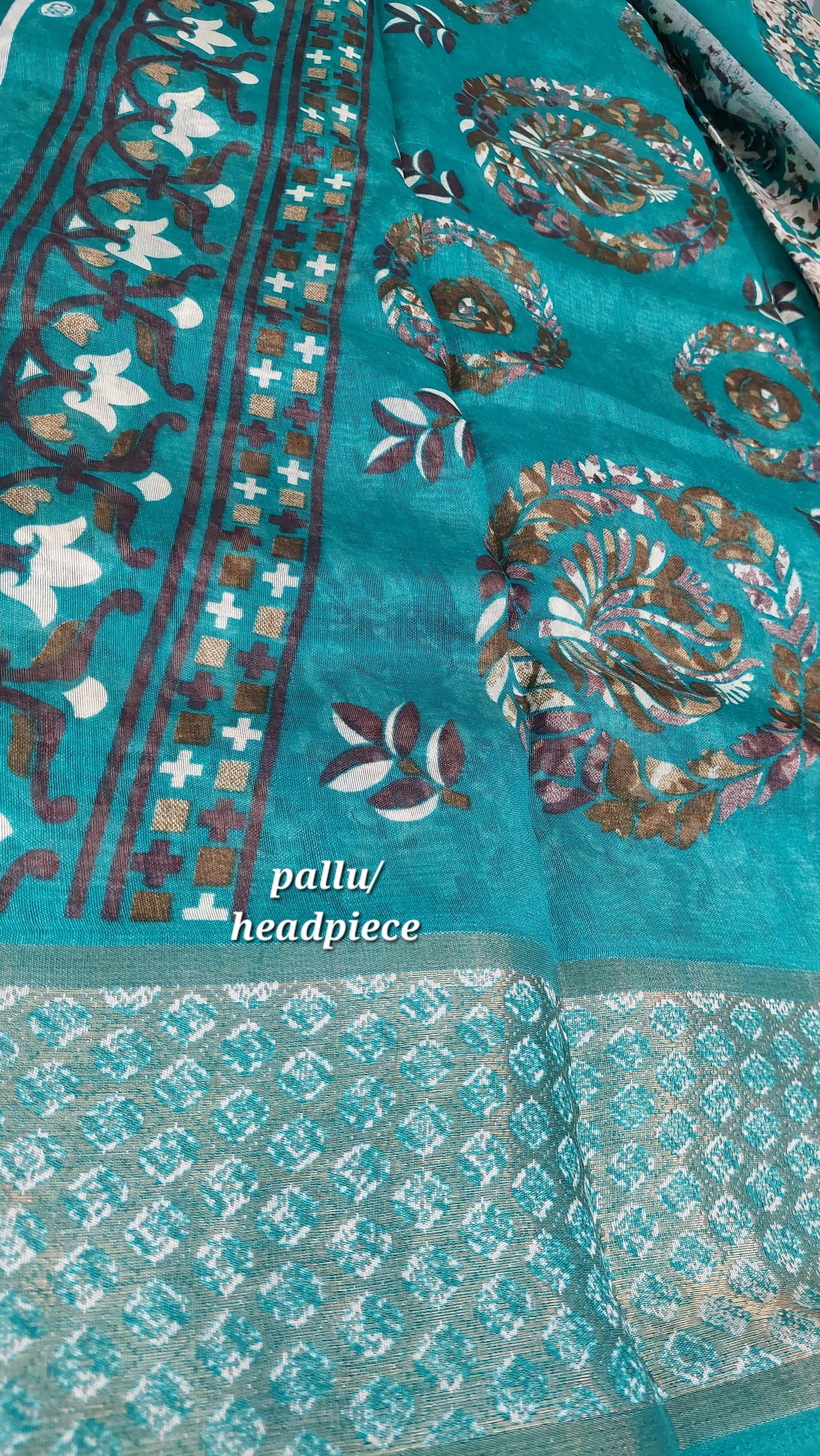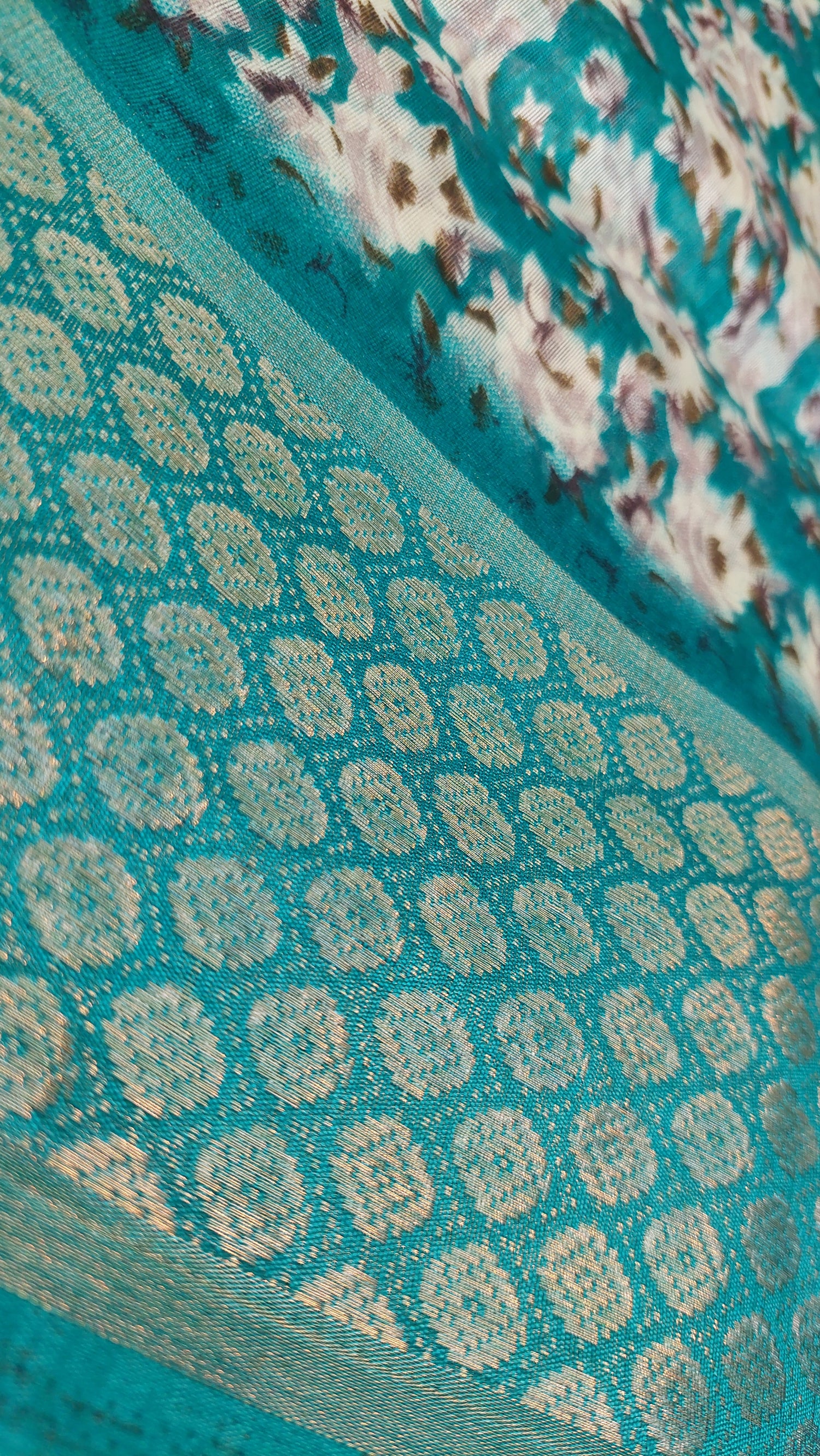 Mixed cotton floral printed saree with golf zari polka dot border. Contracting pallu/headpiece. Running plain blouse.