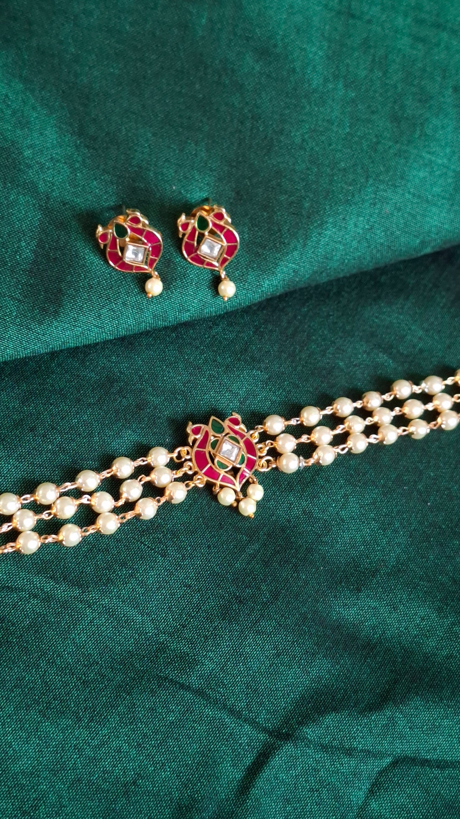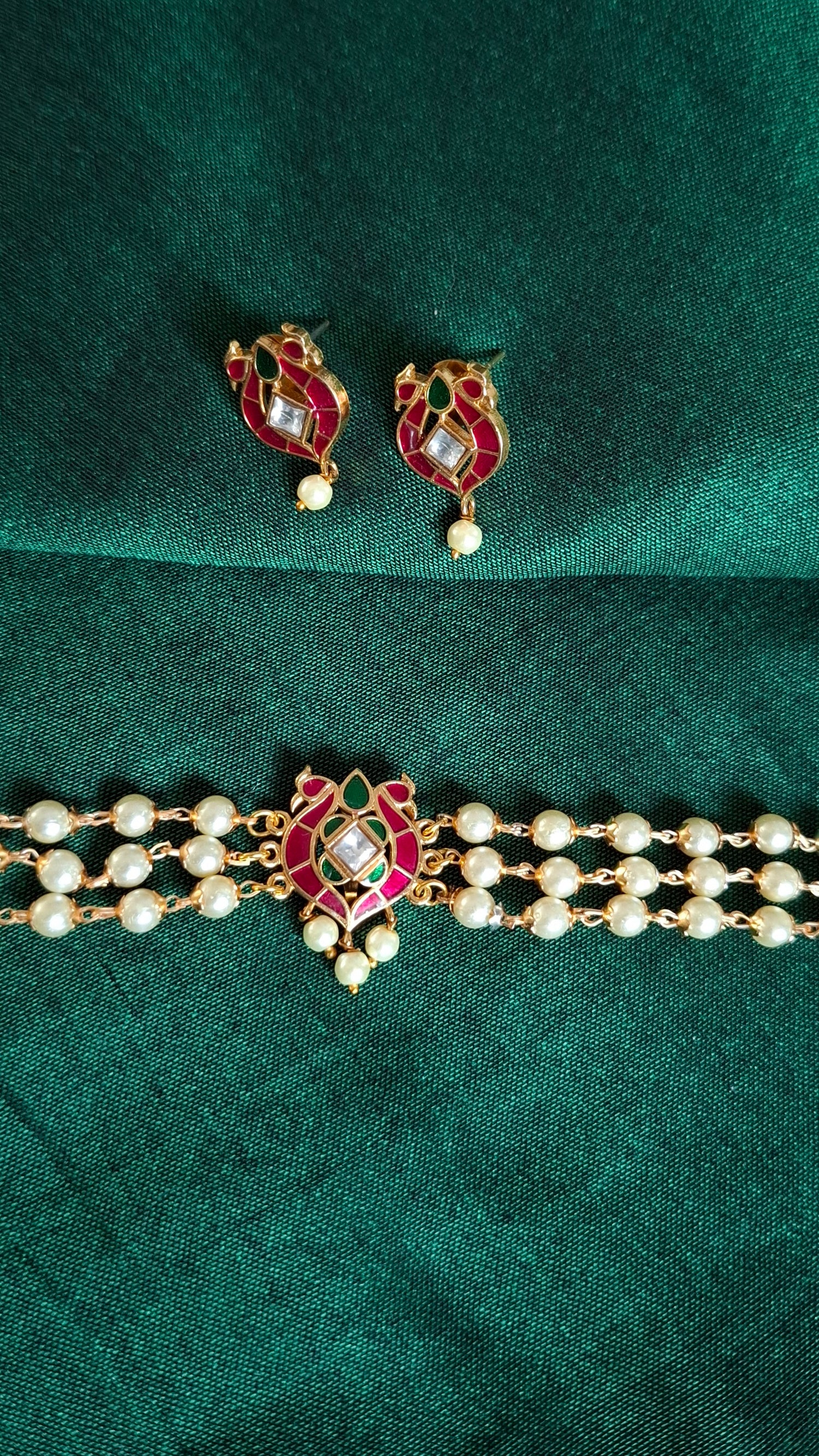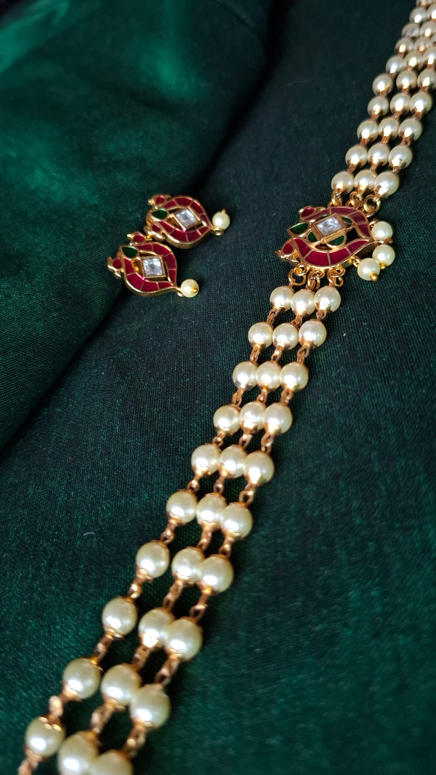 Triple line pearl choker with anam inspired kemp pendant. Comes with matching earrings.