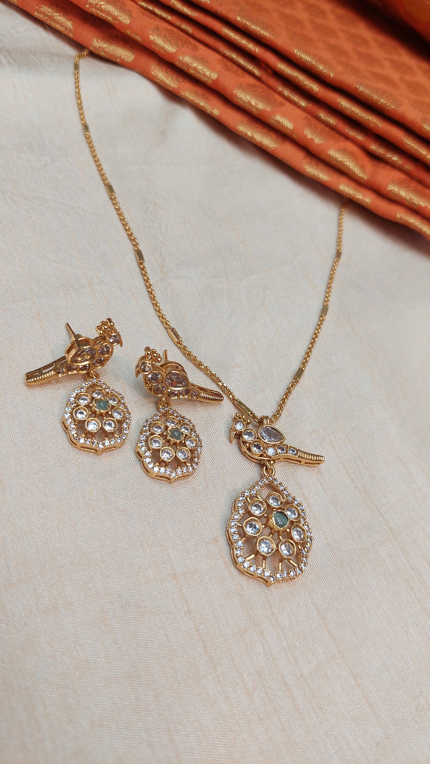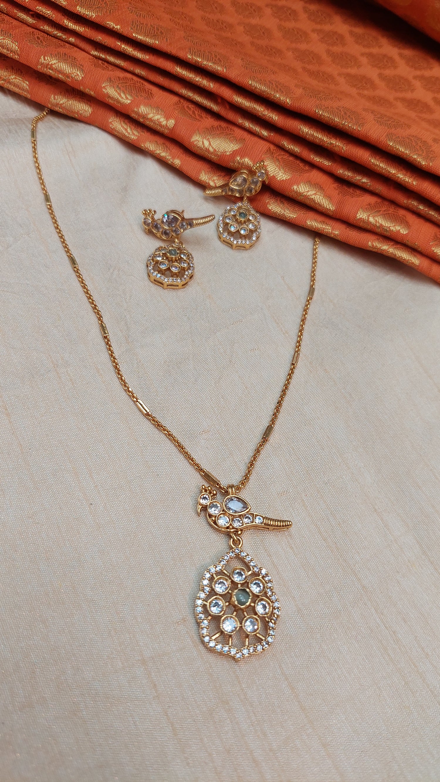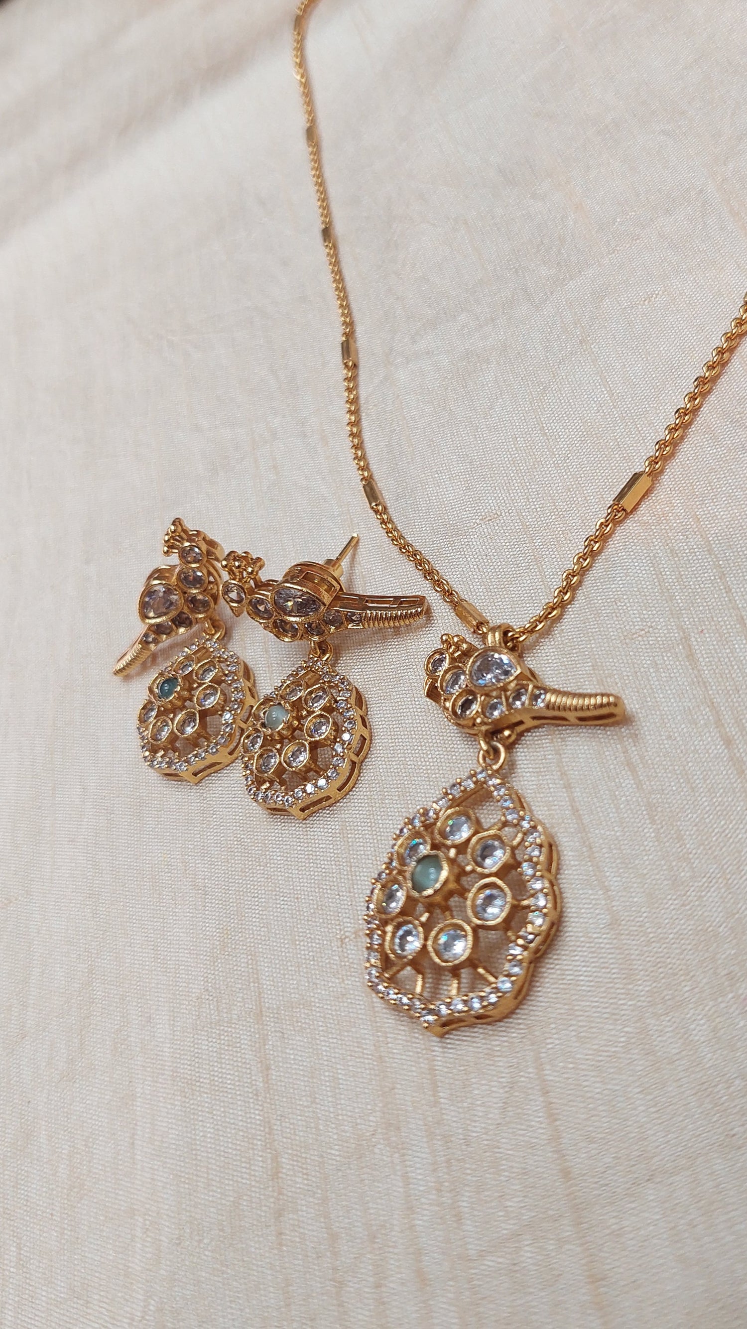 Matte gold finish gold chain with parrot design pendant. Comes with matching earrings.