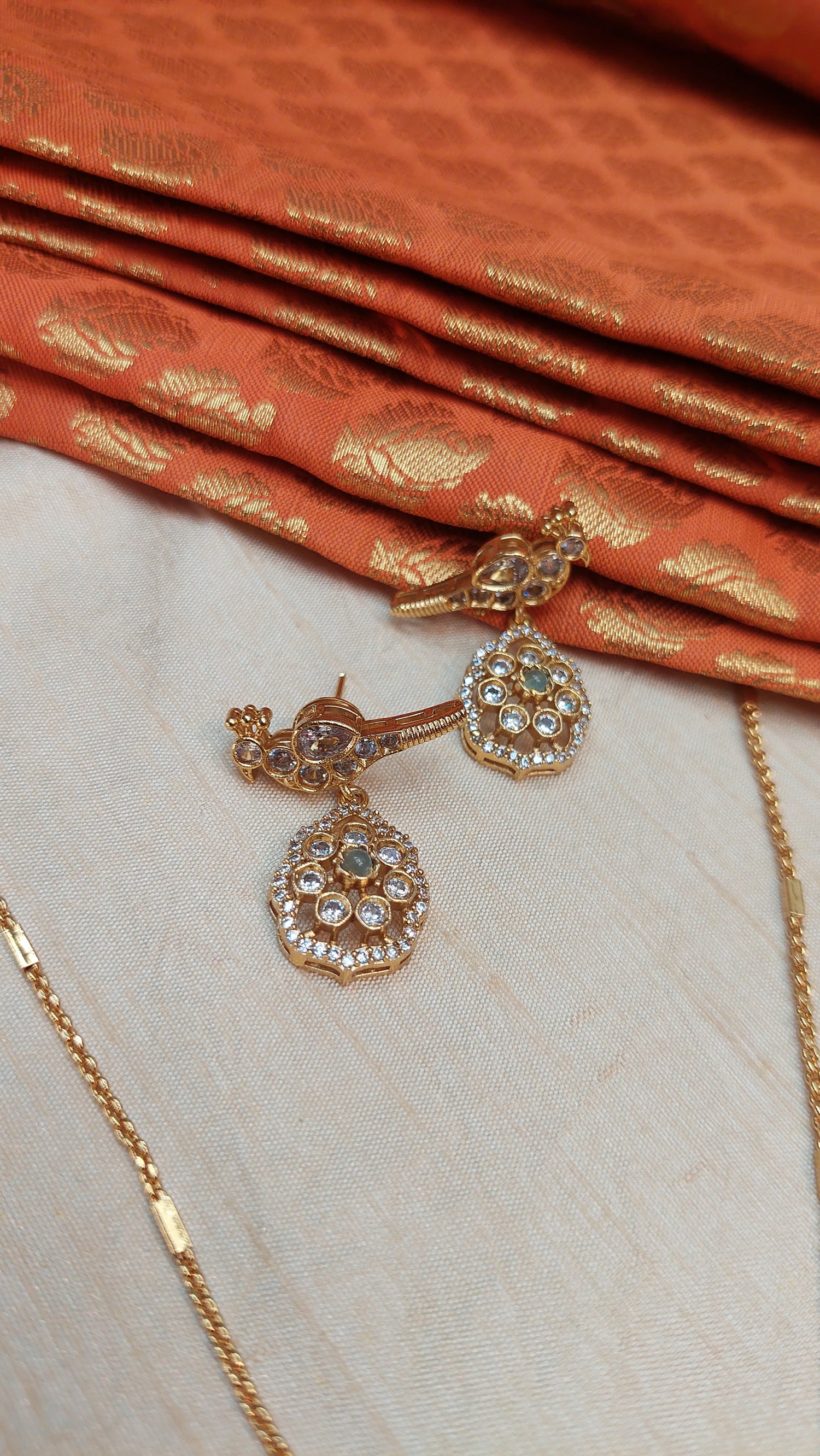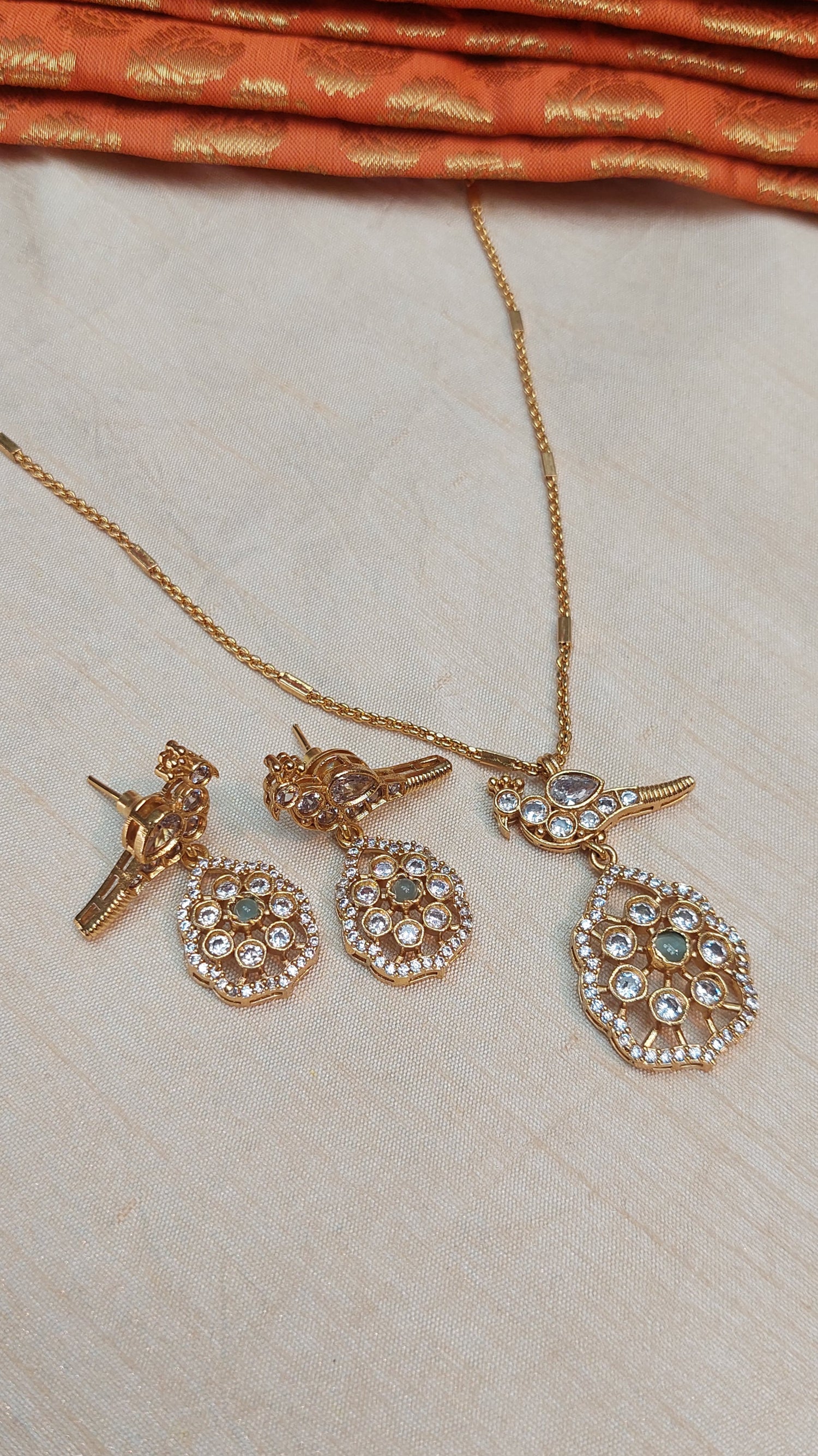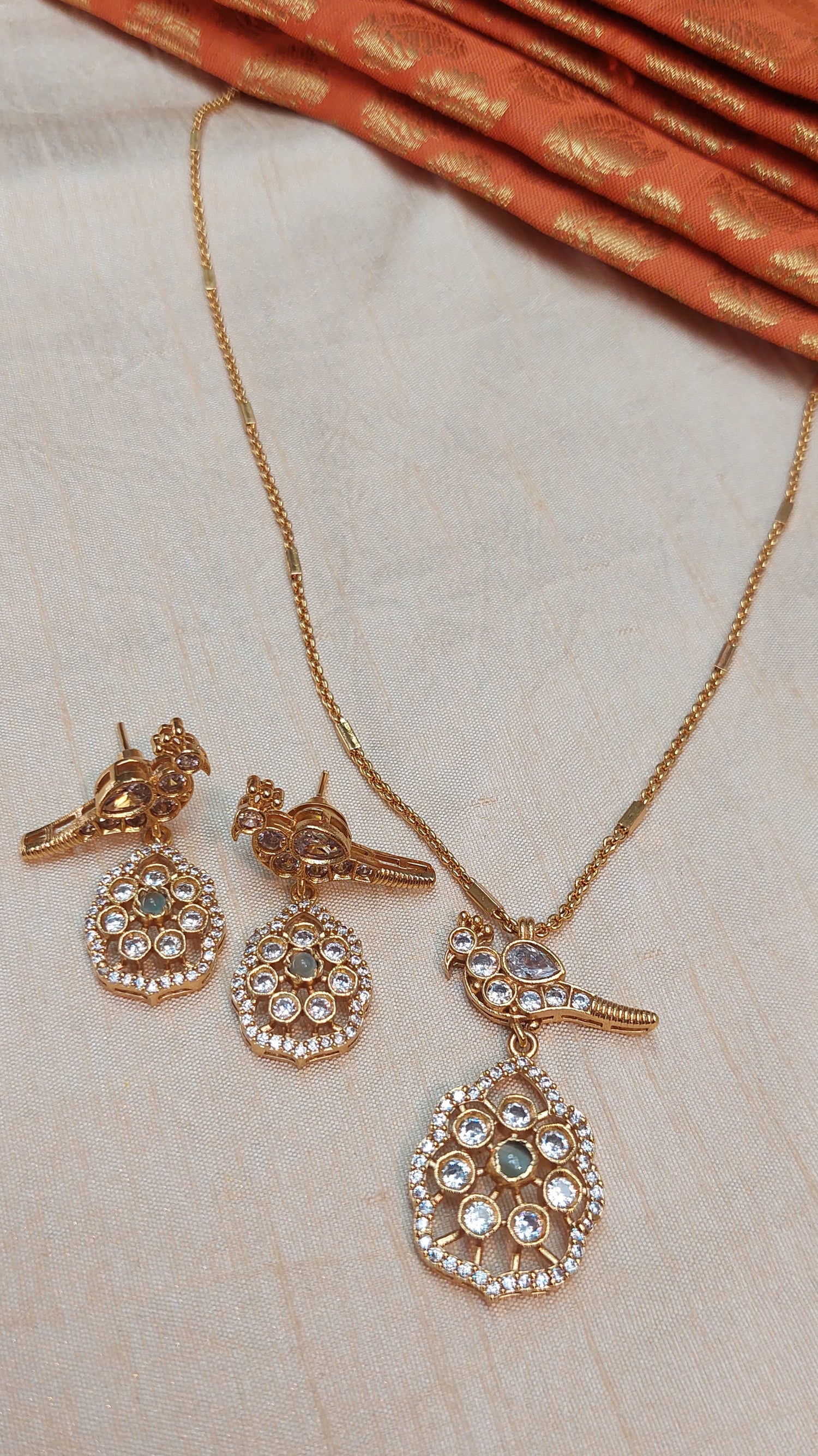 Matte gold finish gold chain with parrot design pendant. Comes with matching earrings.