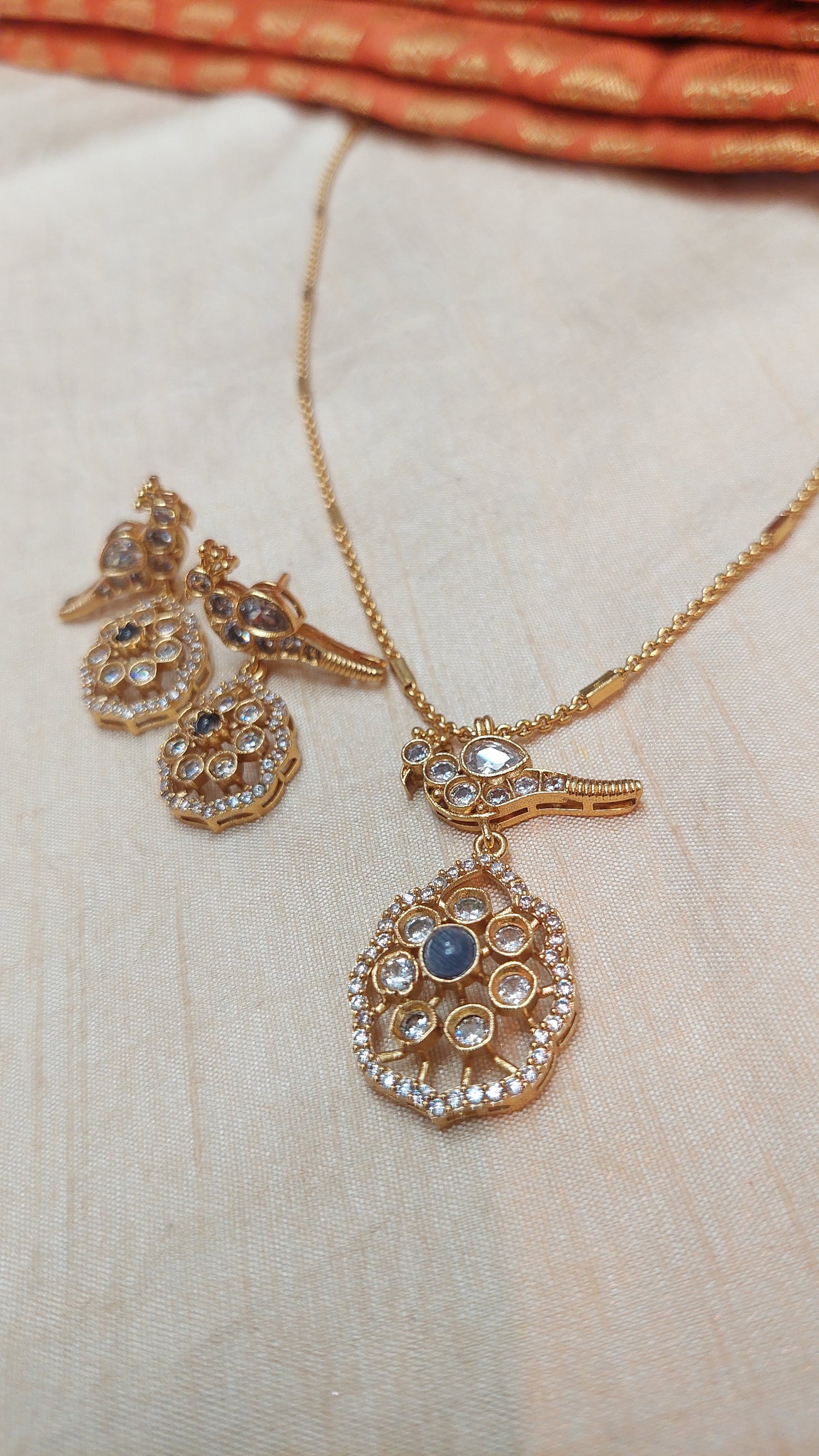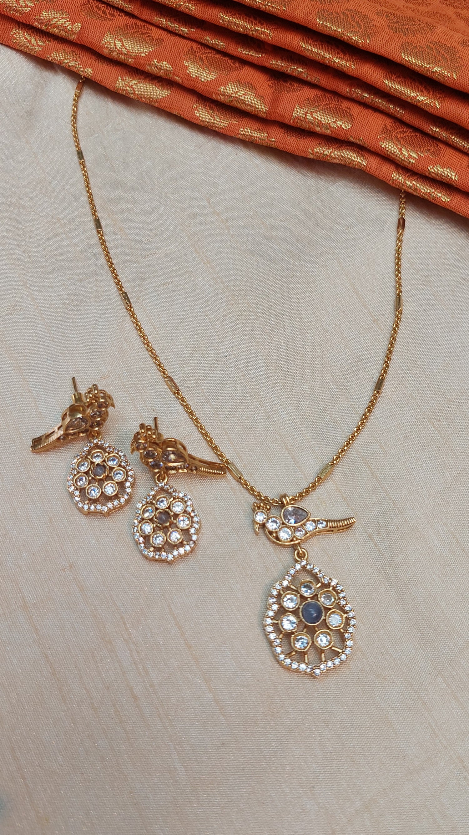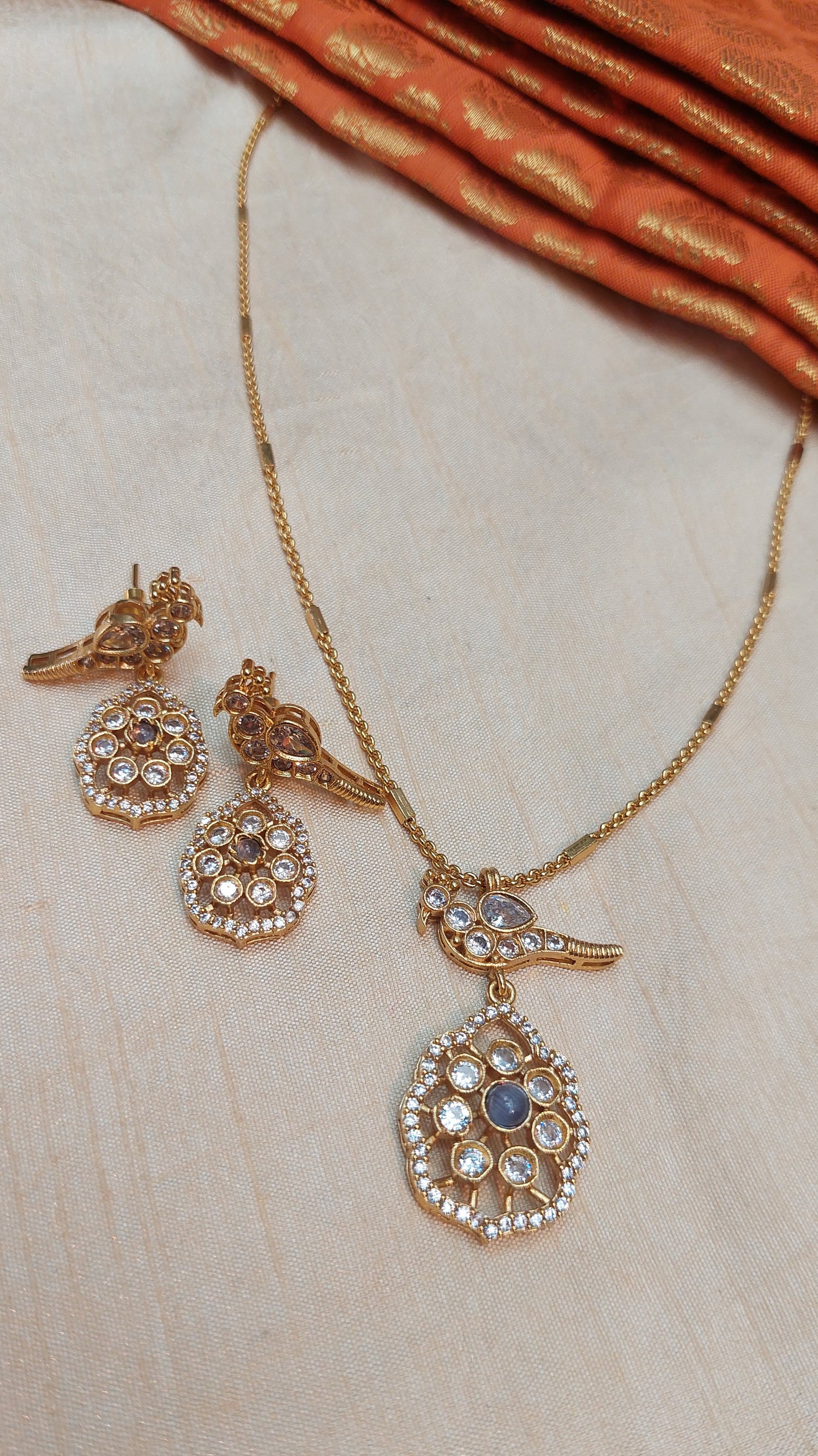 Matte gold finish gold chain with parrot design pendant. Comes with matching earrings.
