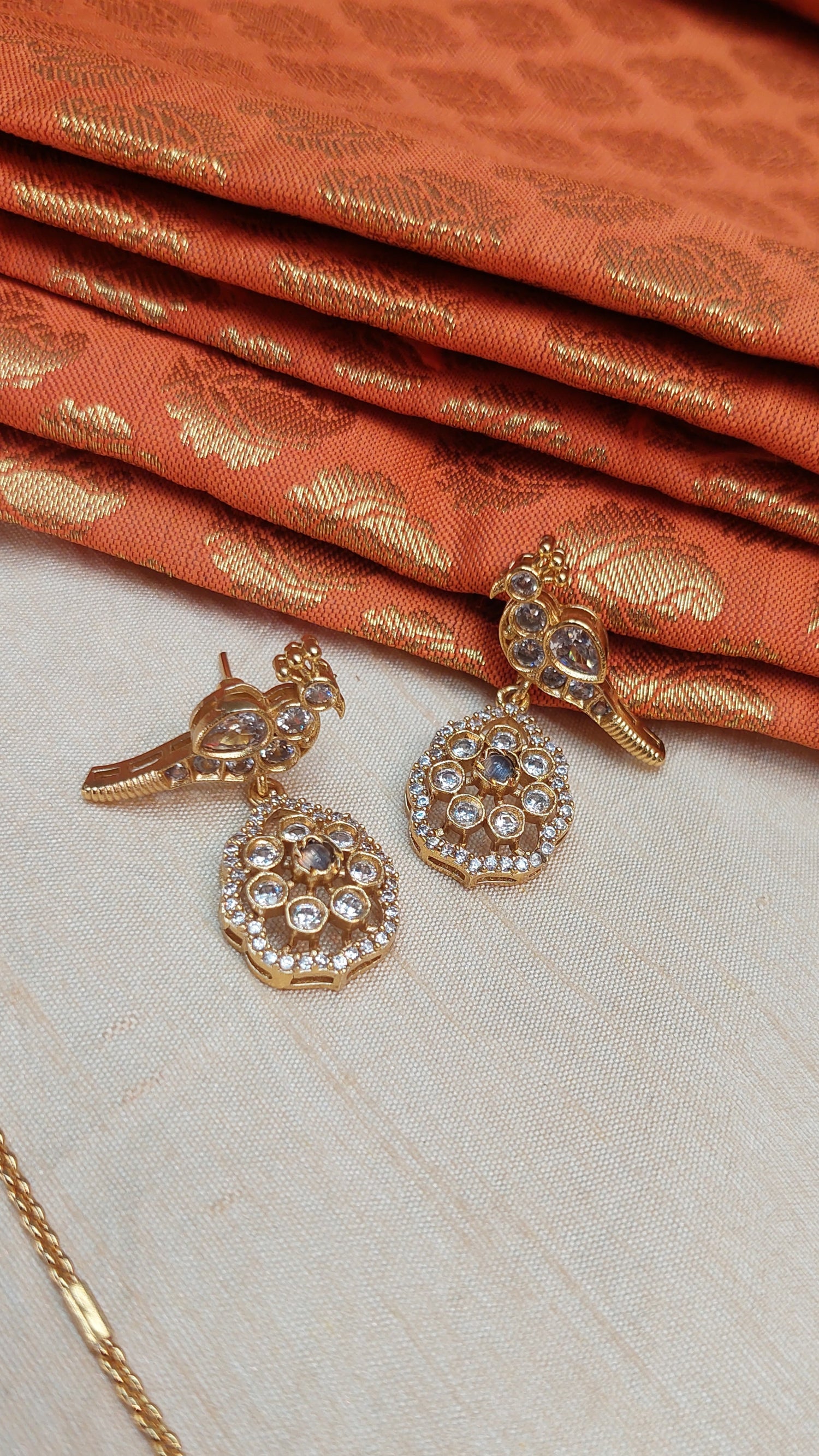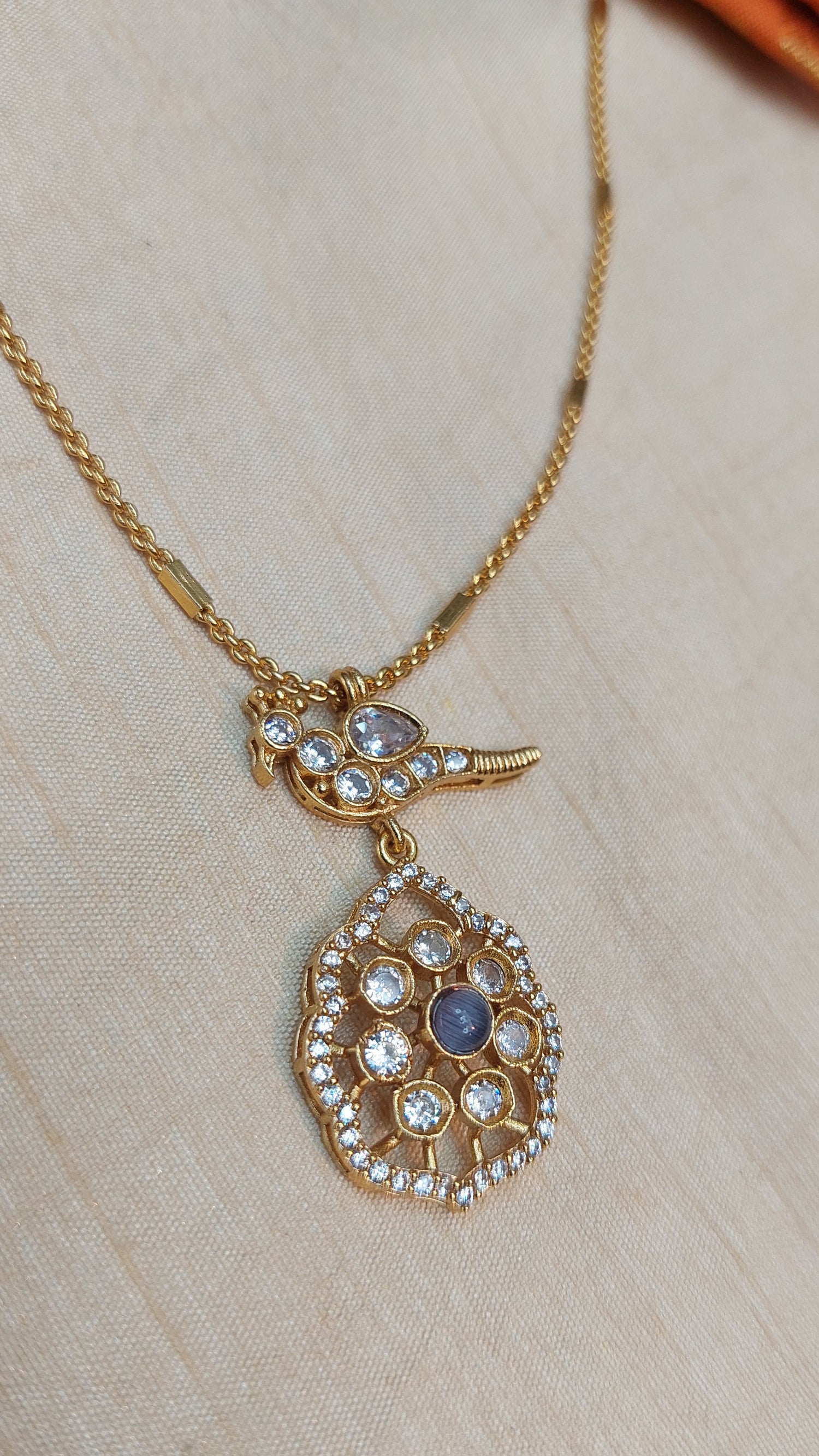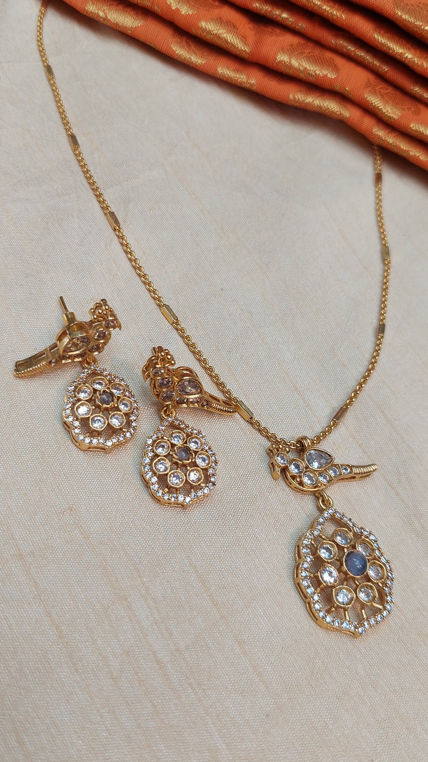 Matte gold finish gold chain with parrot design pendant. Comes with matching earrings.