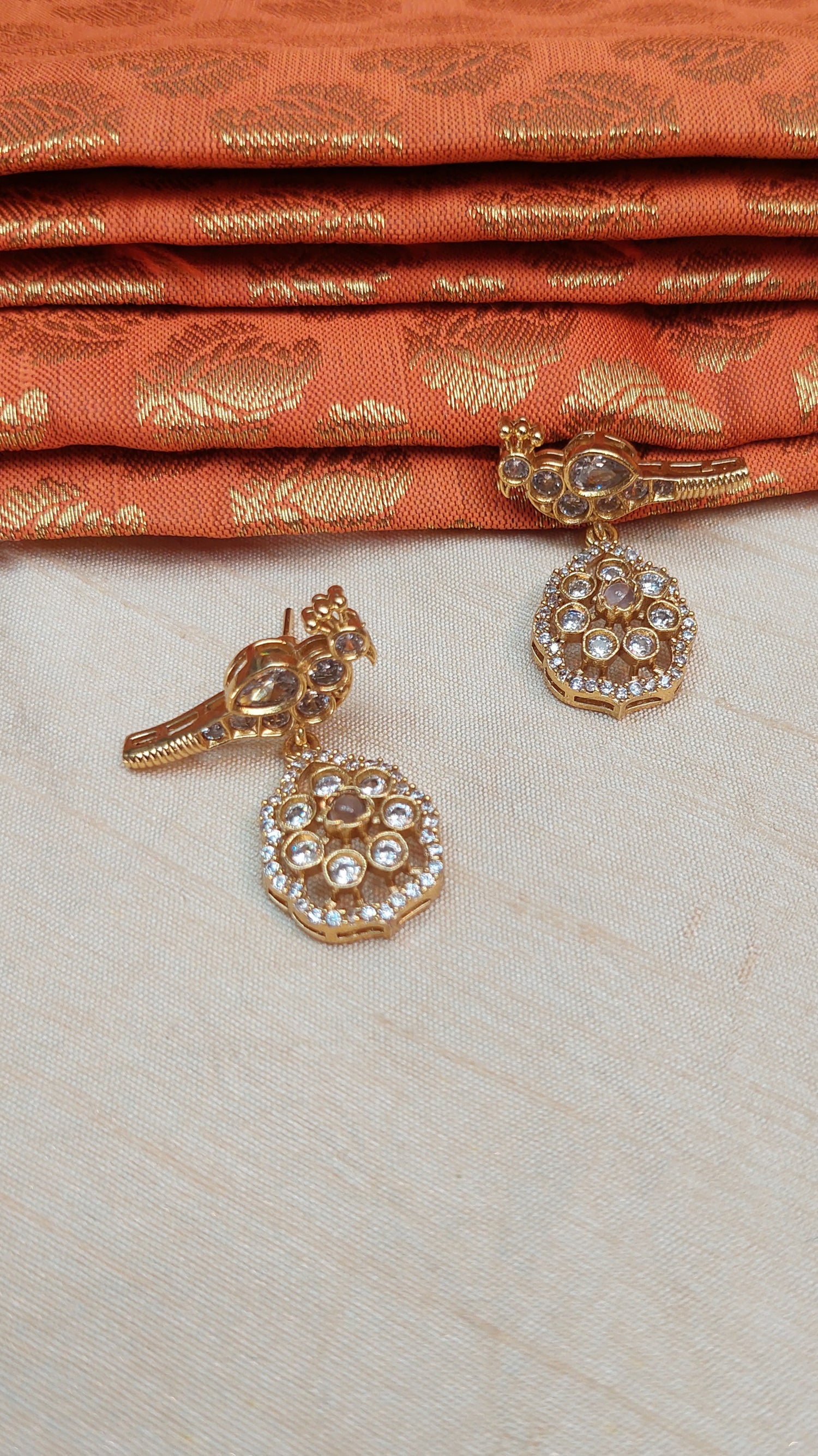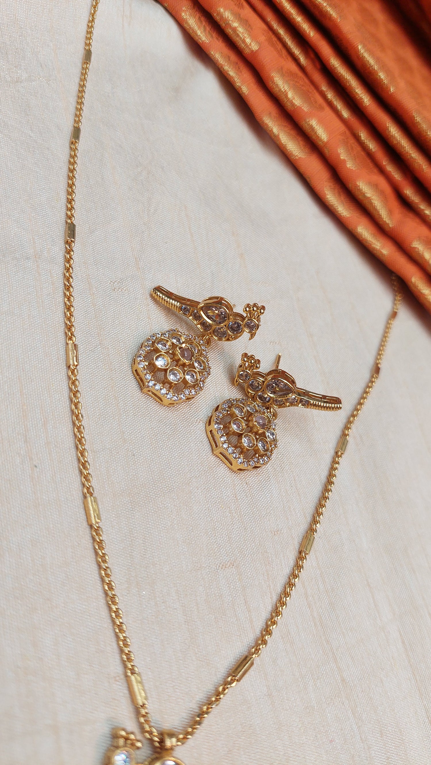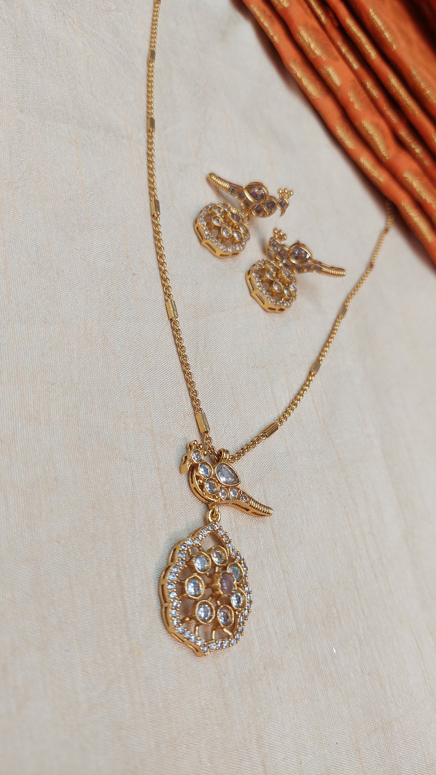 Matte gold finish gold chain with parrot design pendant. Comes with matching earrings.