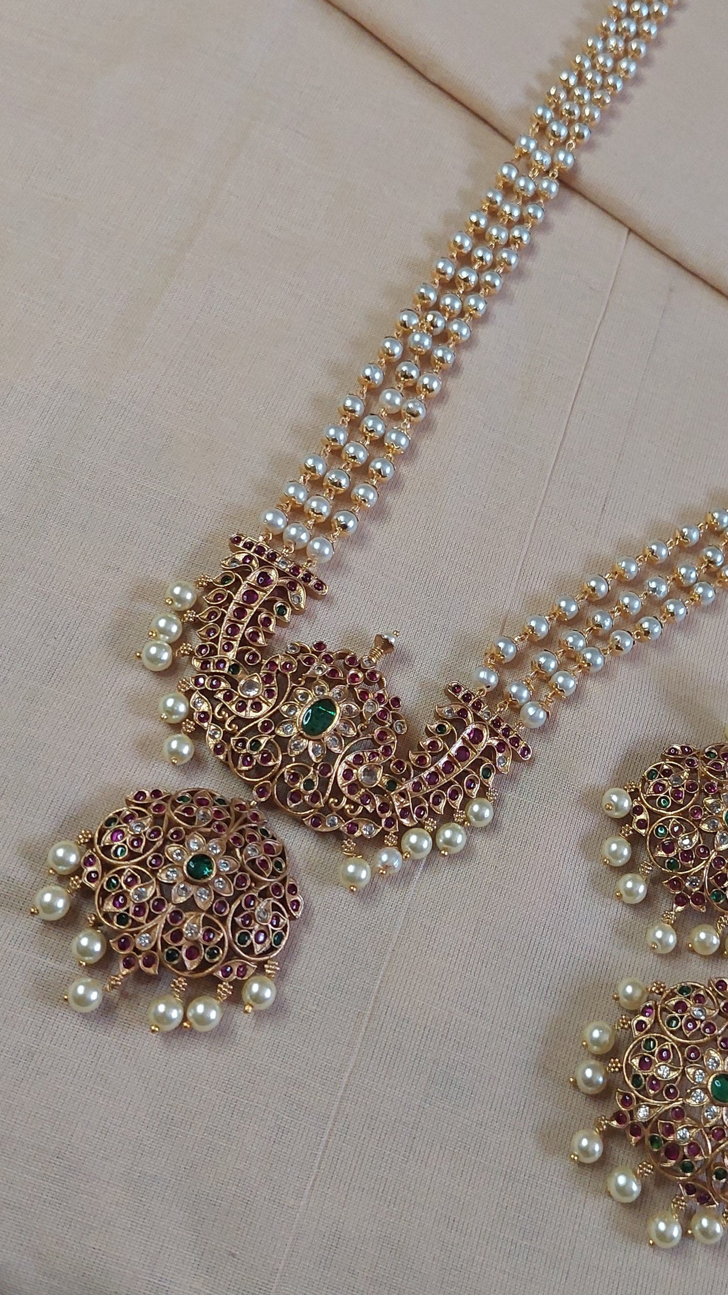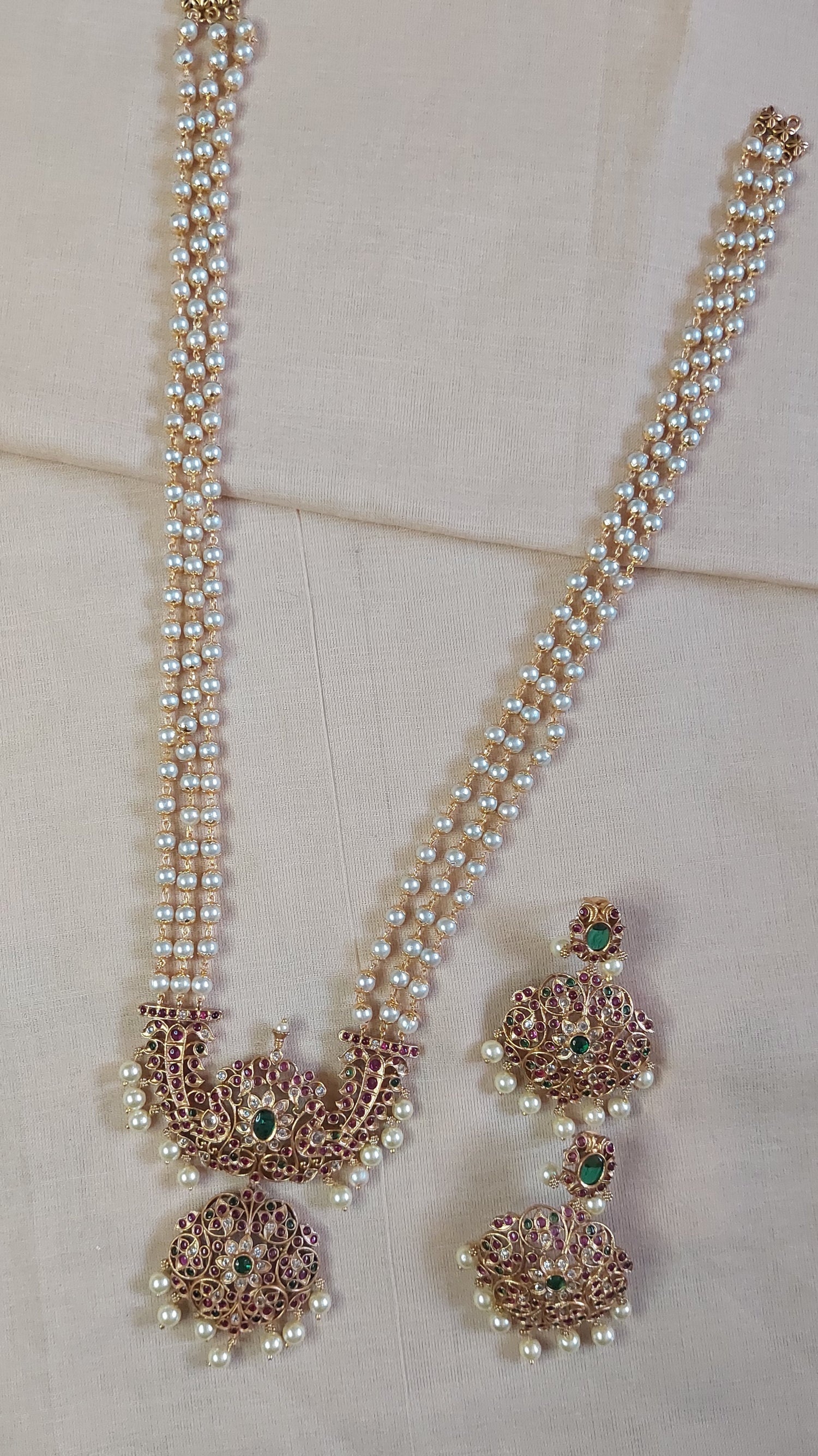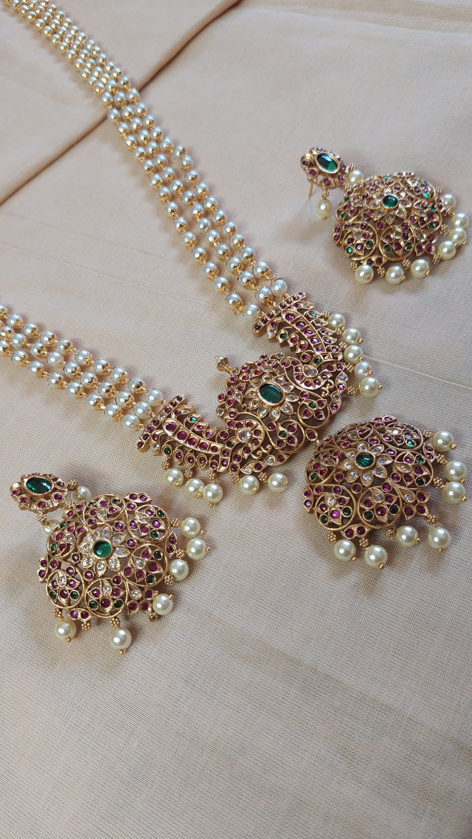 3 layer pearl chains attached to kemp pendant. Comes with matching earrings.