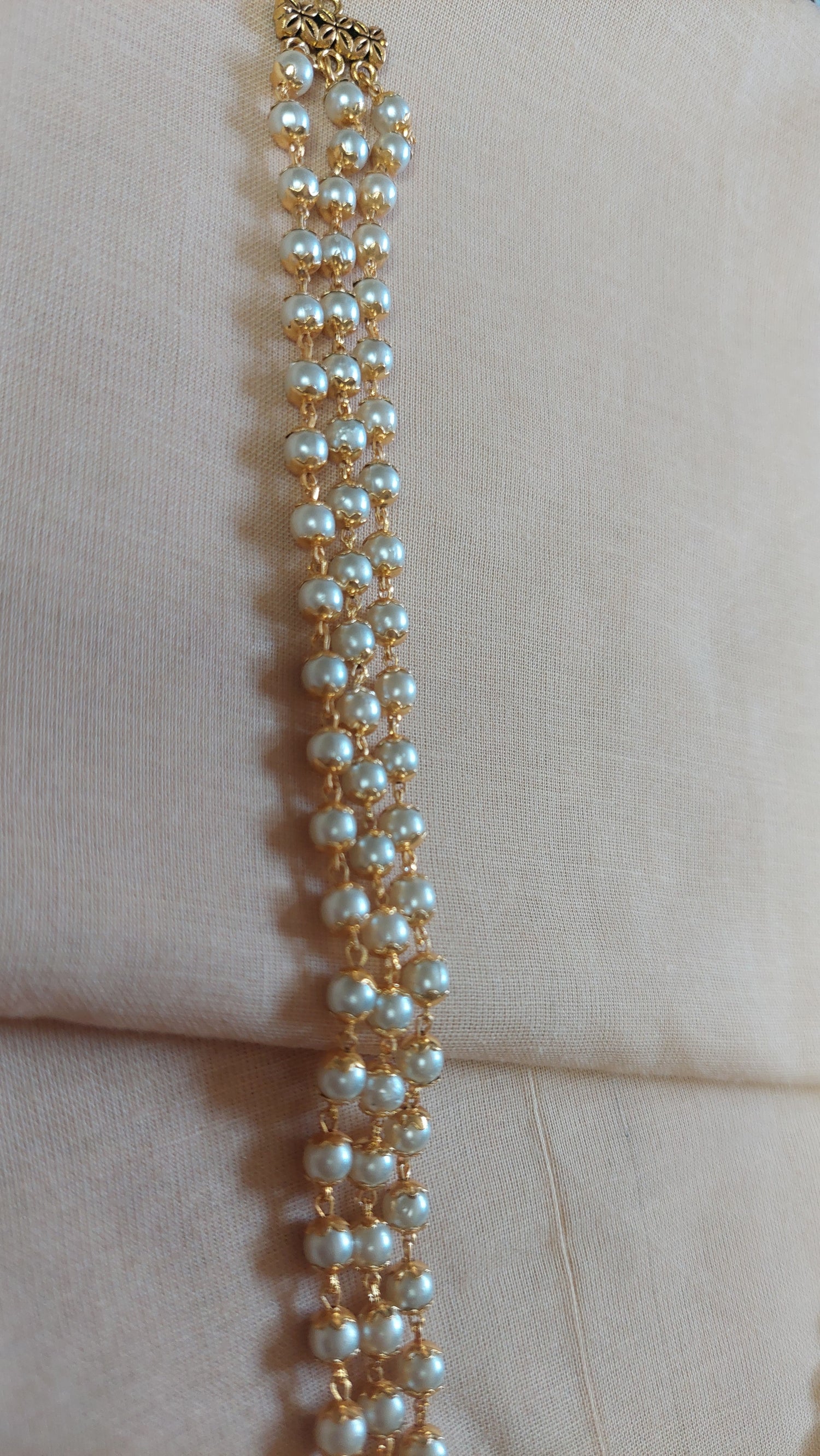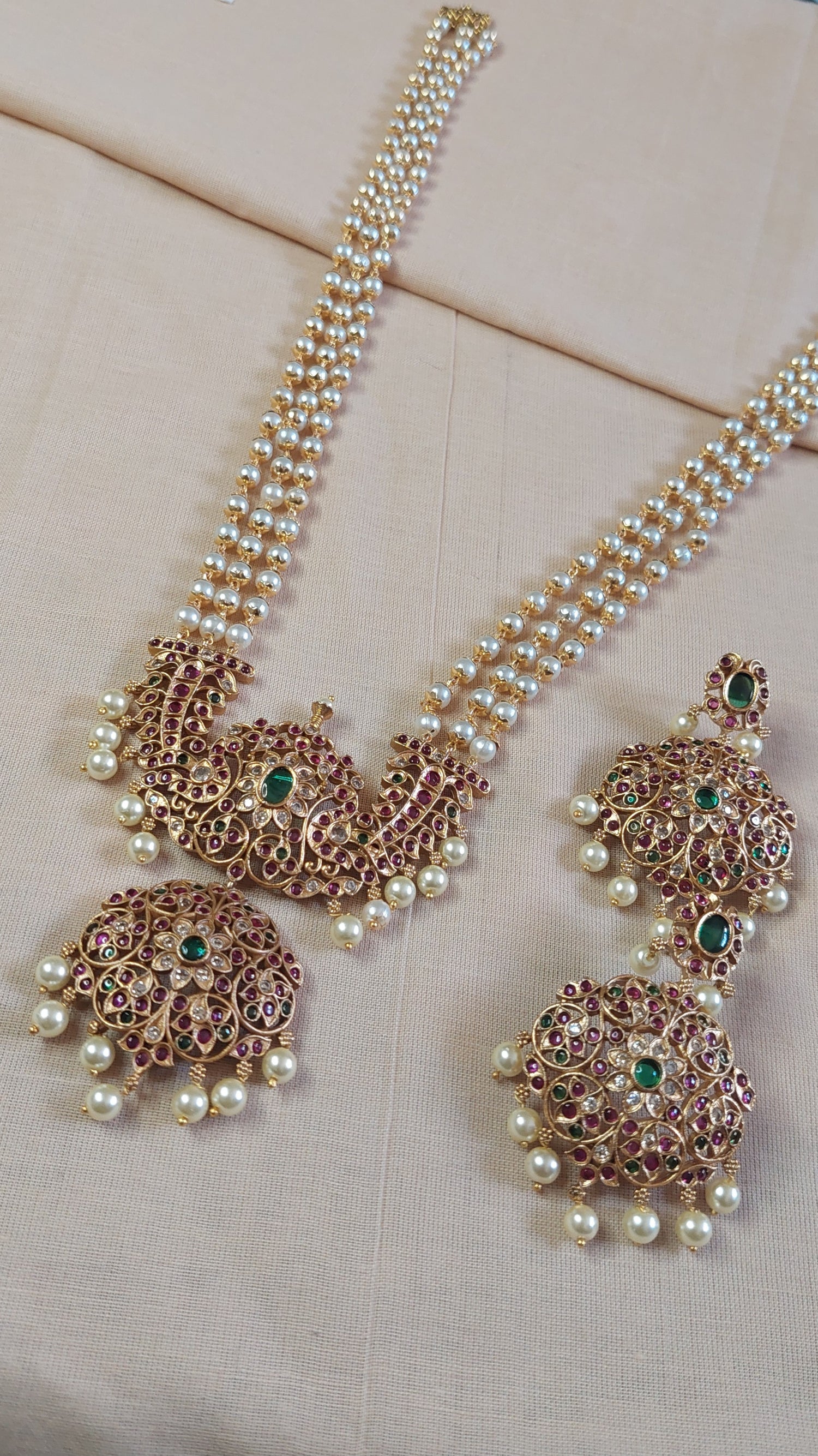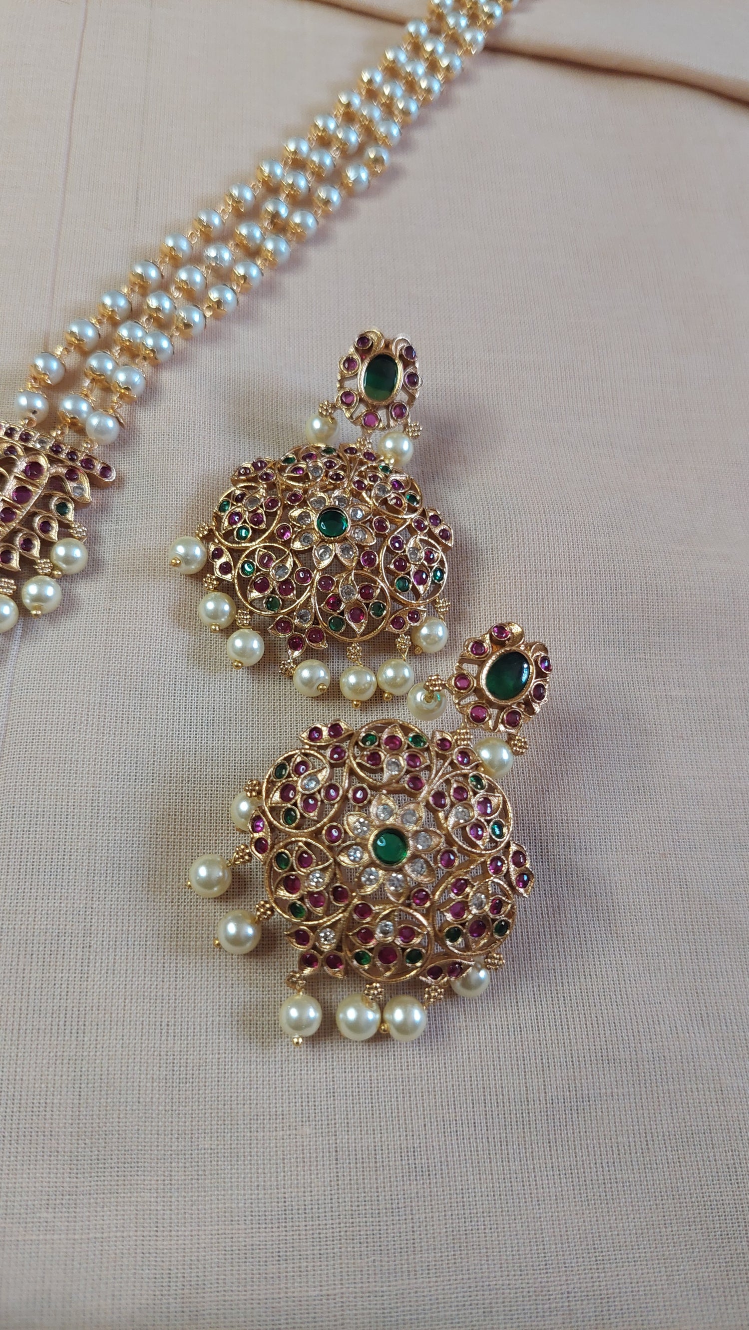 3 layer pearl chains attached to kemp pendant. Comes with matching earrings.