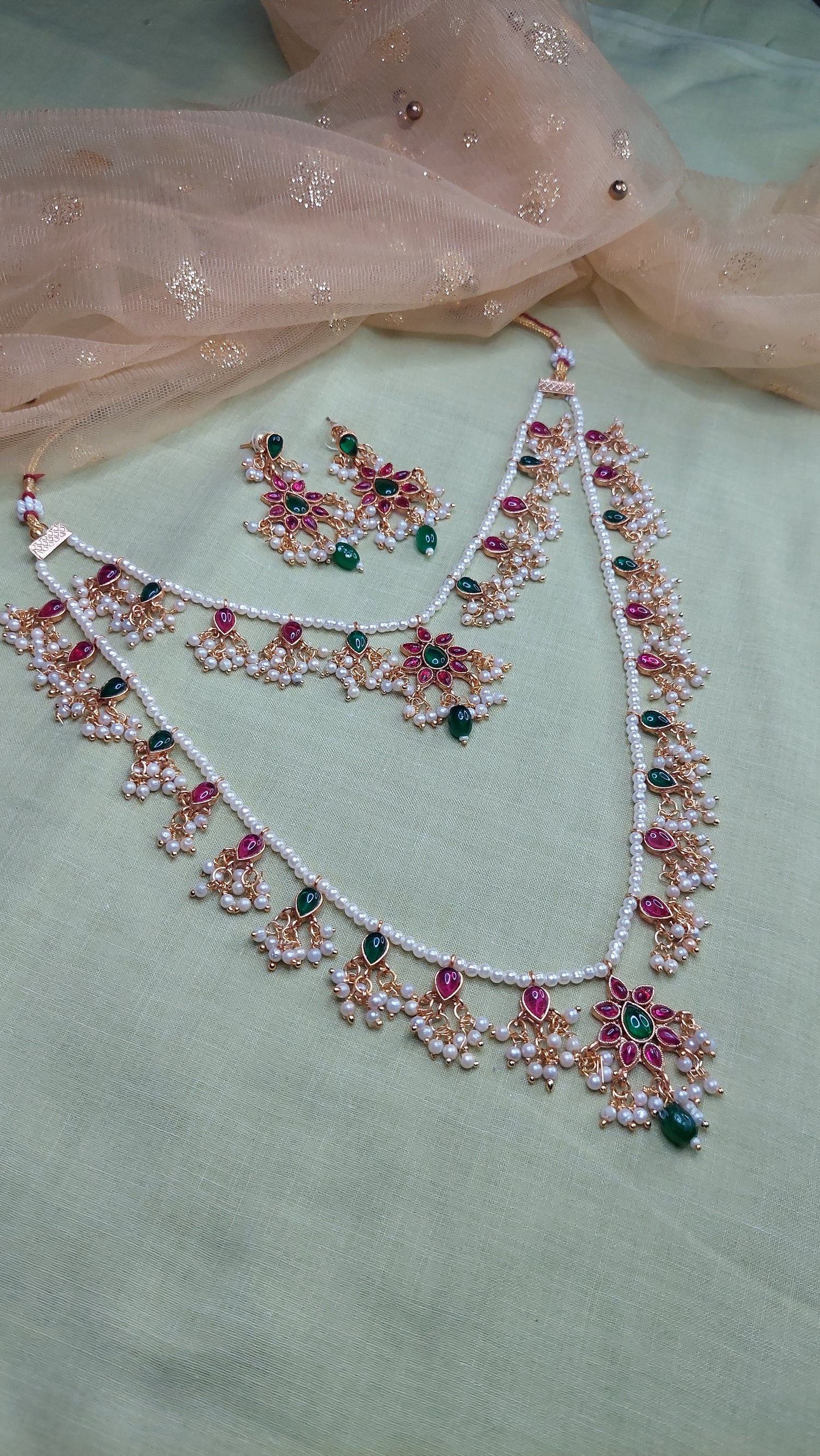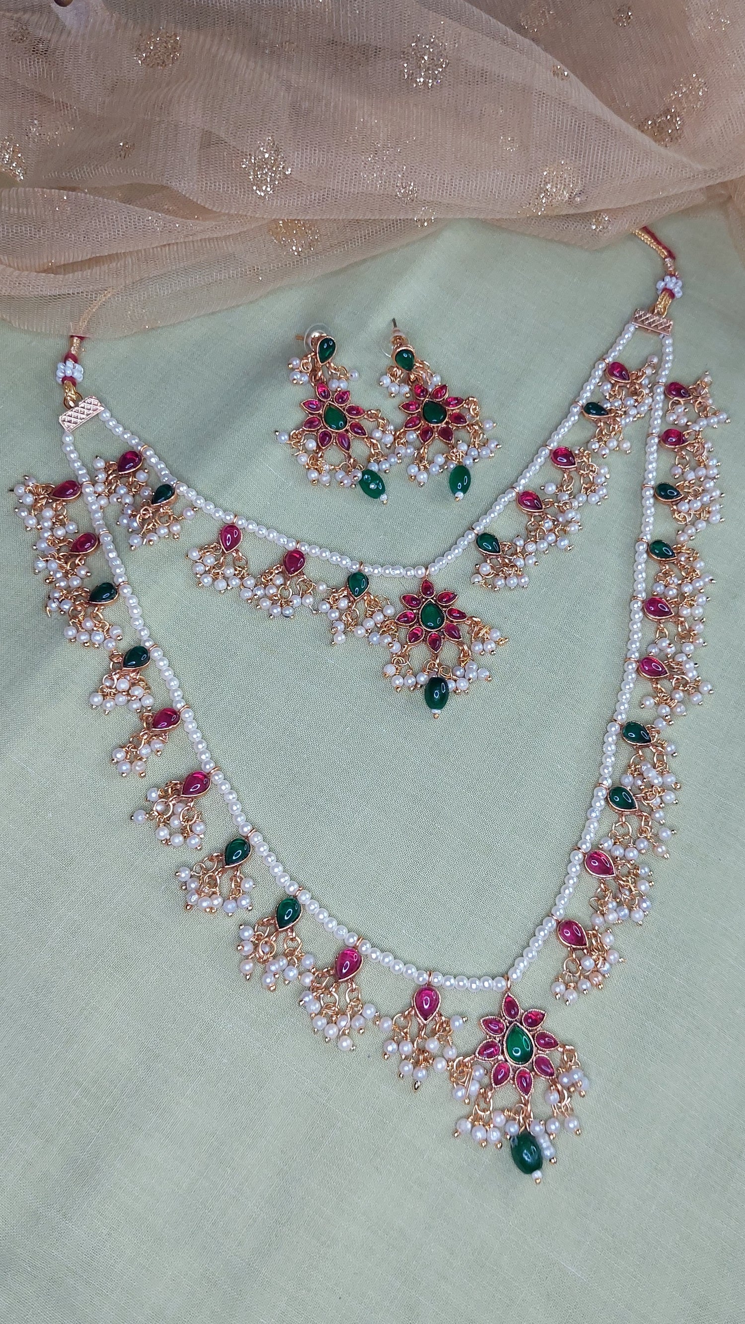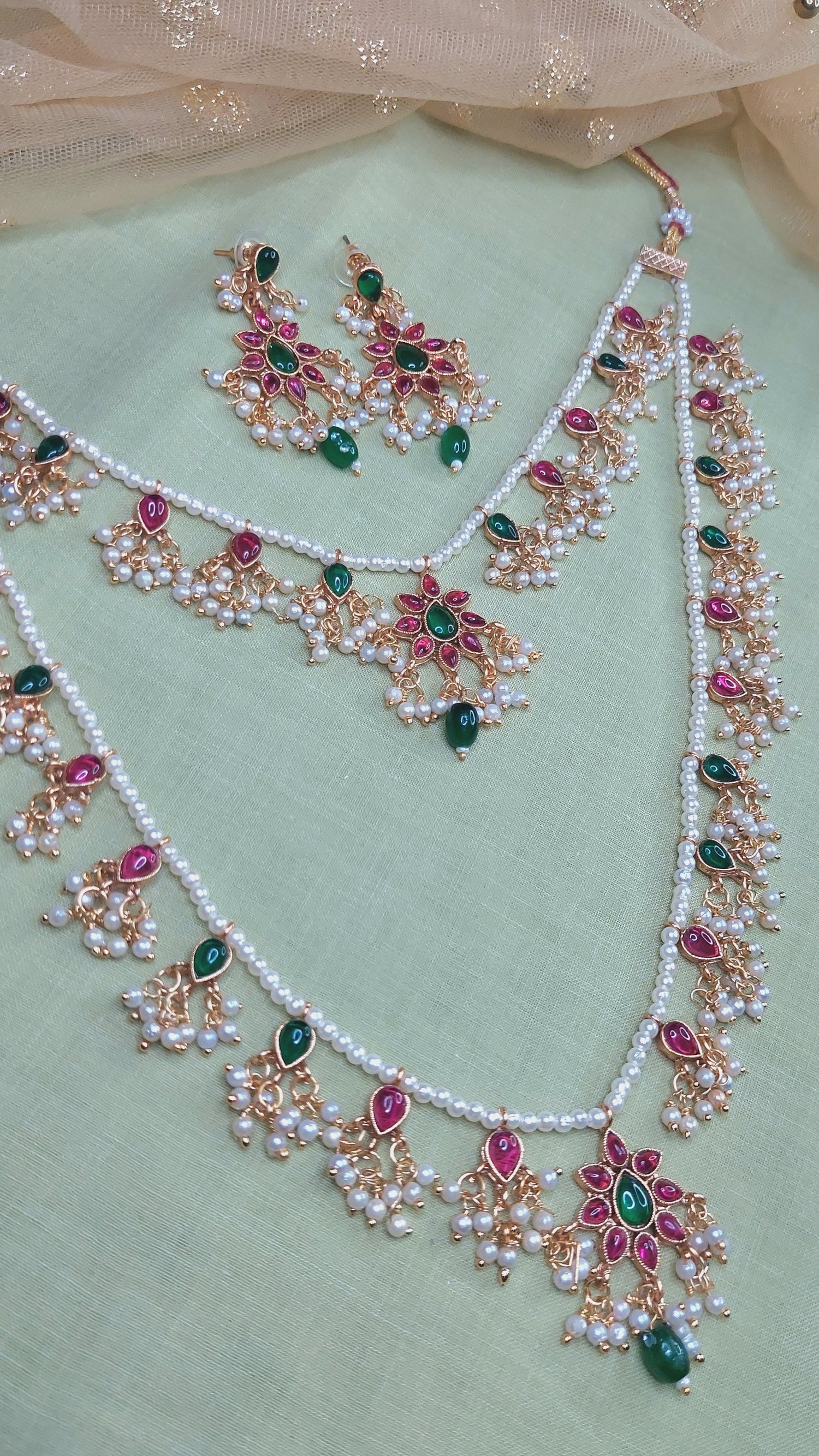 Layered Jadau Kundan Pearl Neckpiece- pendants- Jadau Kundan work with clustered pearls. Antique gold finish. Comes with matching earrings.