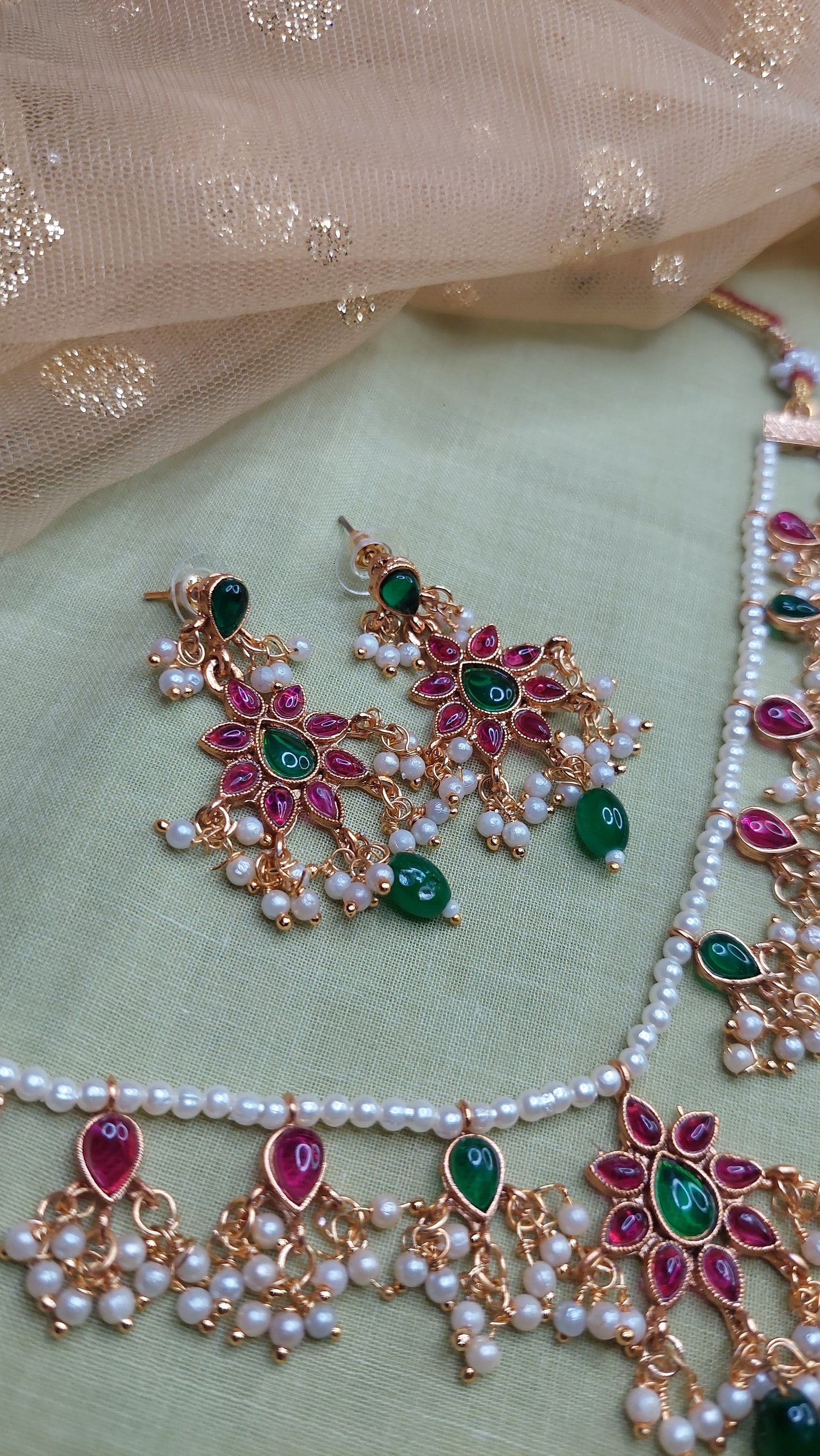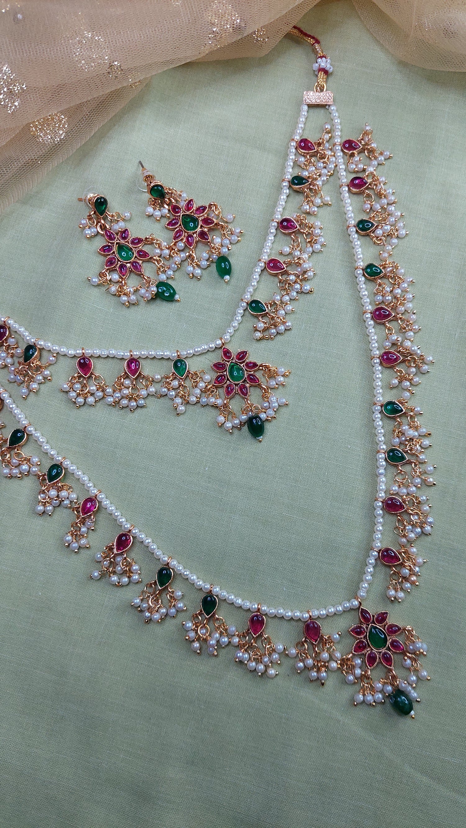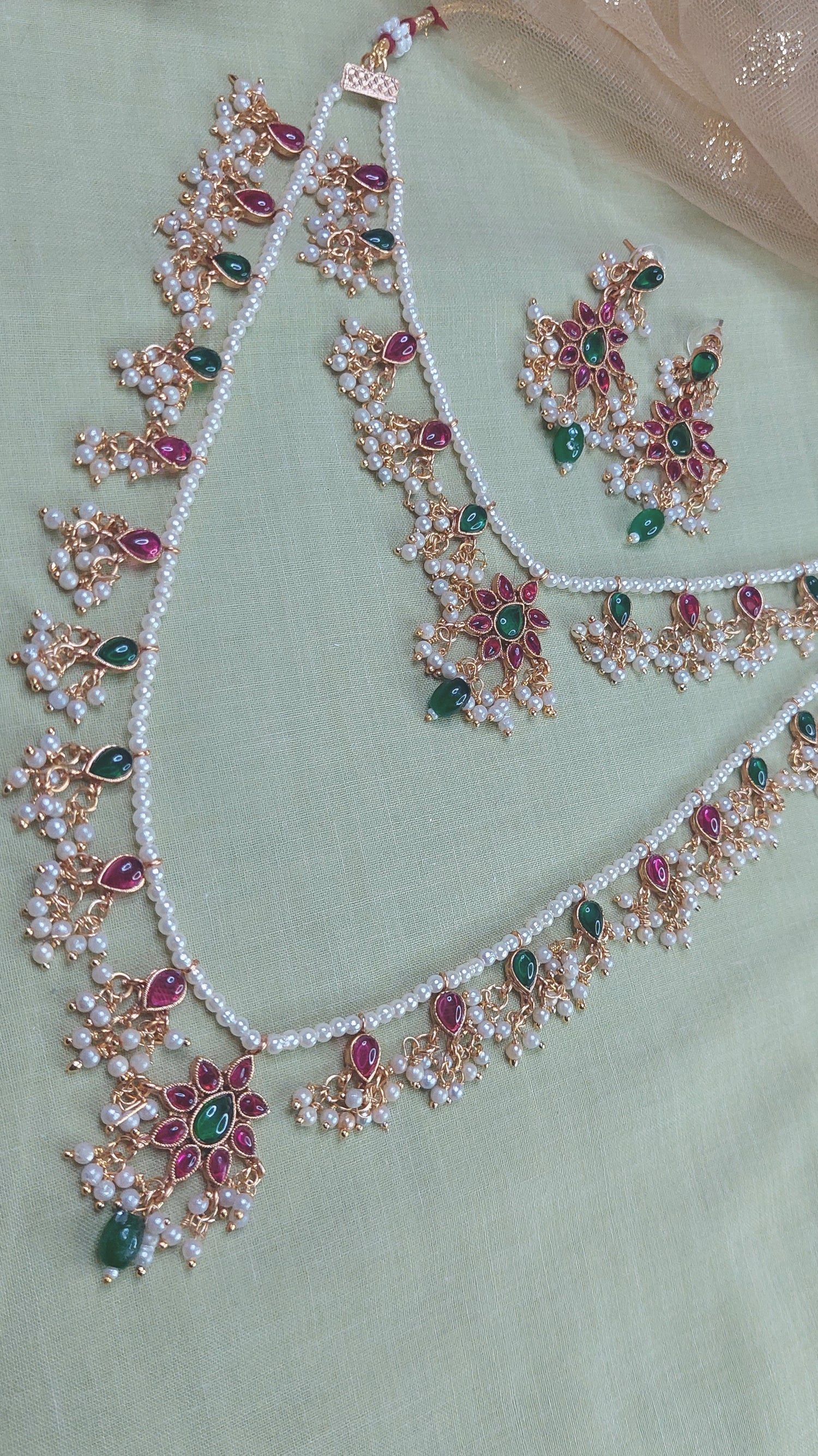 Layered Jadau Kundan Pearl Neckpiece- pendants- Jadau Kundan work with clustered pearls. Antique gold finish. Comes with matching earrings.